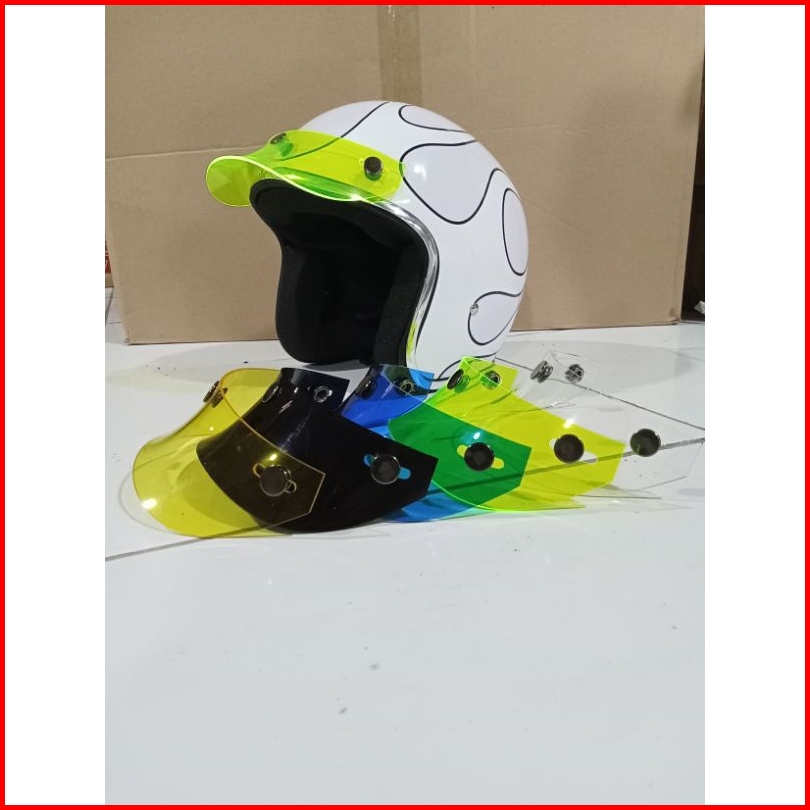 Kaca datar hitam, Kaca datar putih, Kaca cembung hitam, Kaca cembung putih, Helm+ pet Hitam, + Pet Acrilic Yelow, +Pet Acrilic Blue, +Pet Acrilic Clear, +Pet Acrilic Hitam, +Pet Acrilic Hijau