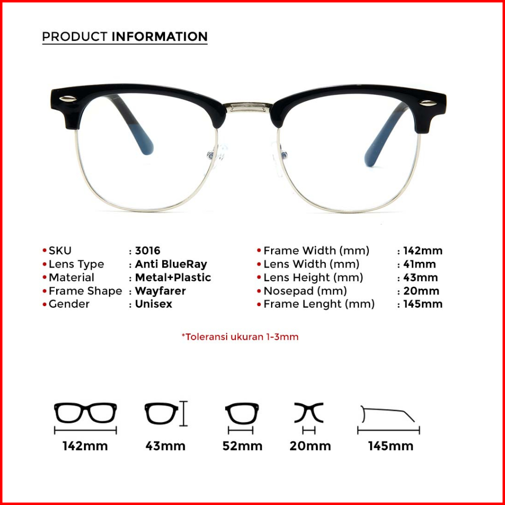 Berrybarton Kacamata Wayfarer Anti Radiasi Photocromic Blueray Kacamata Metal Bisa Minus Pria Wanita 3016 Ab