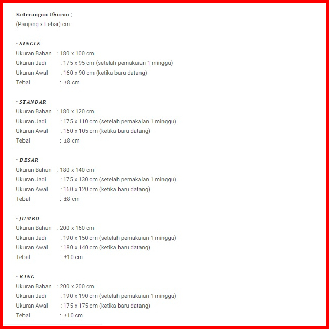 Single (muat 1 org), Standar (muat 2 org), Besar (muat 2+ org), JUMBO (muat 3 org), KING (muat 4 org)