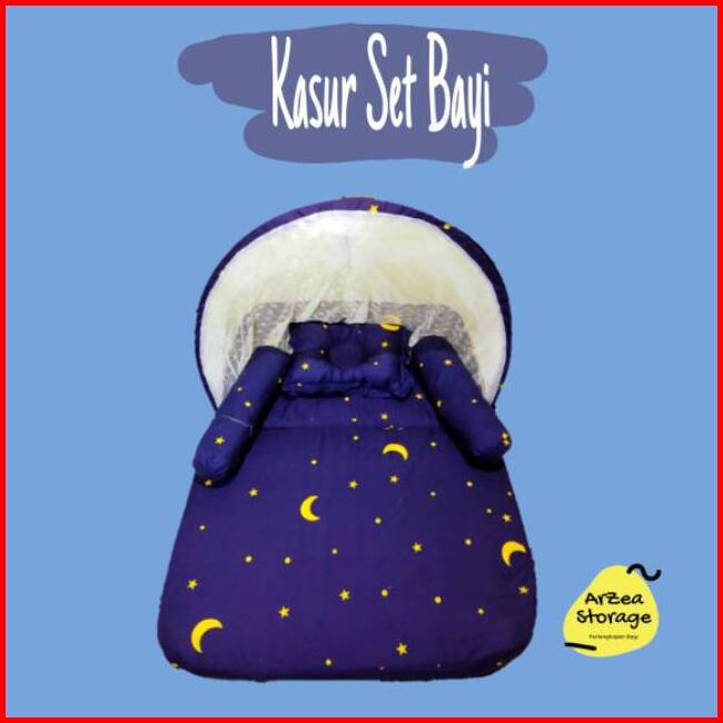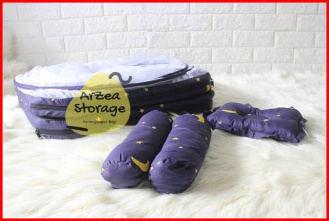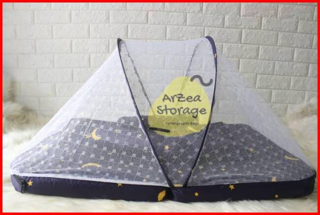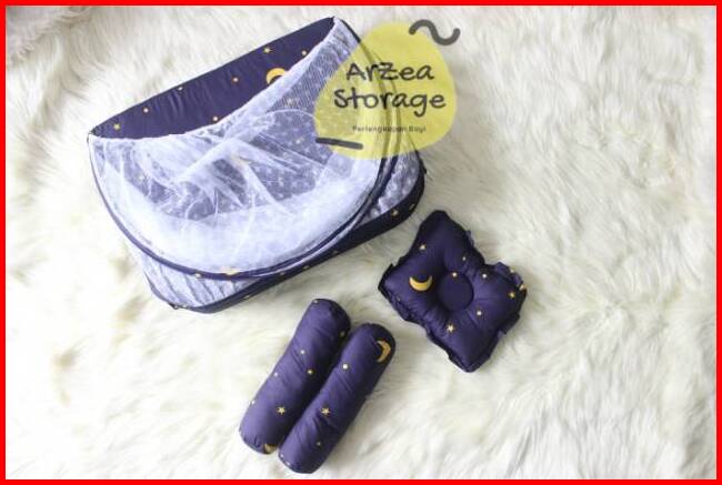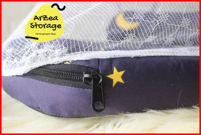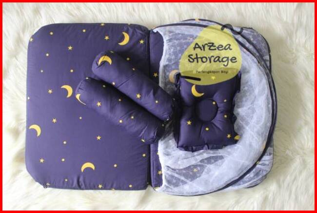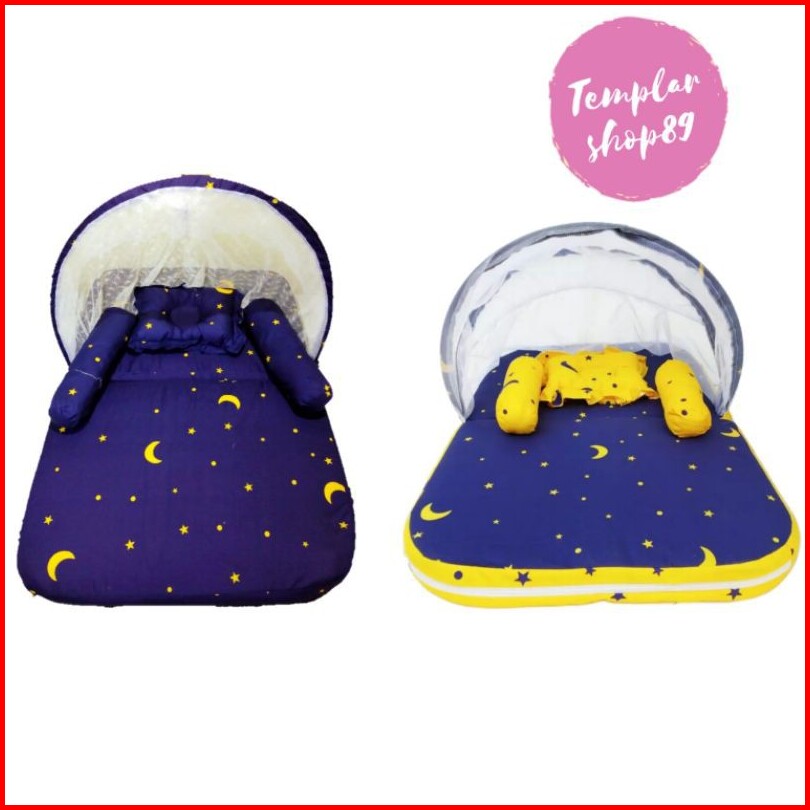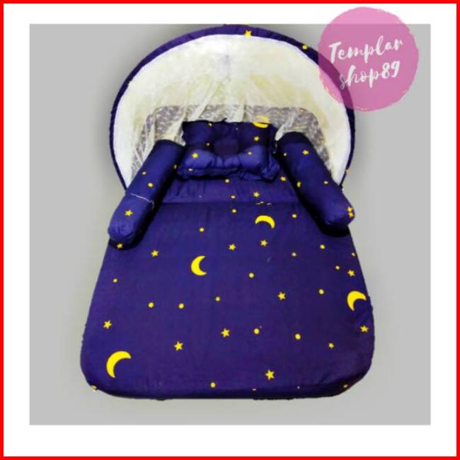 Kasur Bayi Set Kelambu Bantal Guling Bulan Bintang Navy Lipat