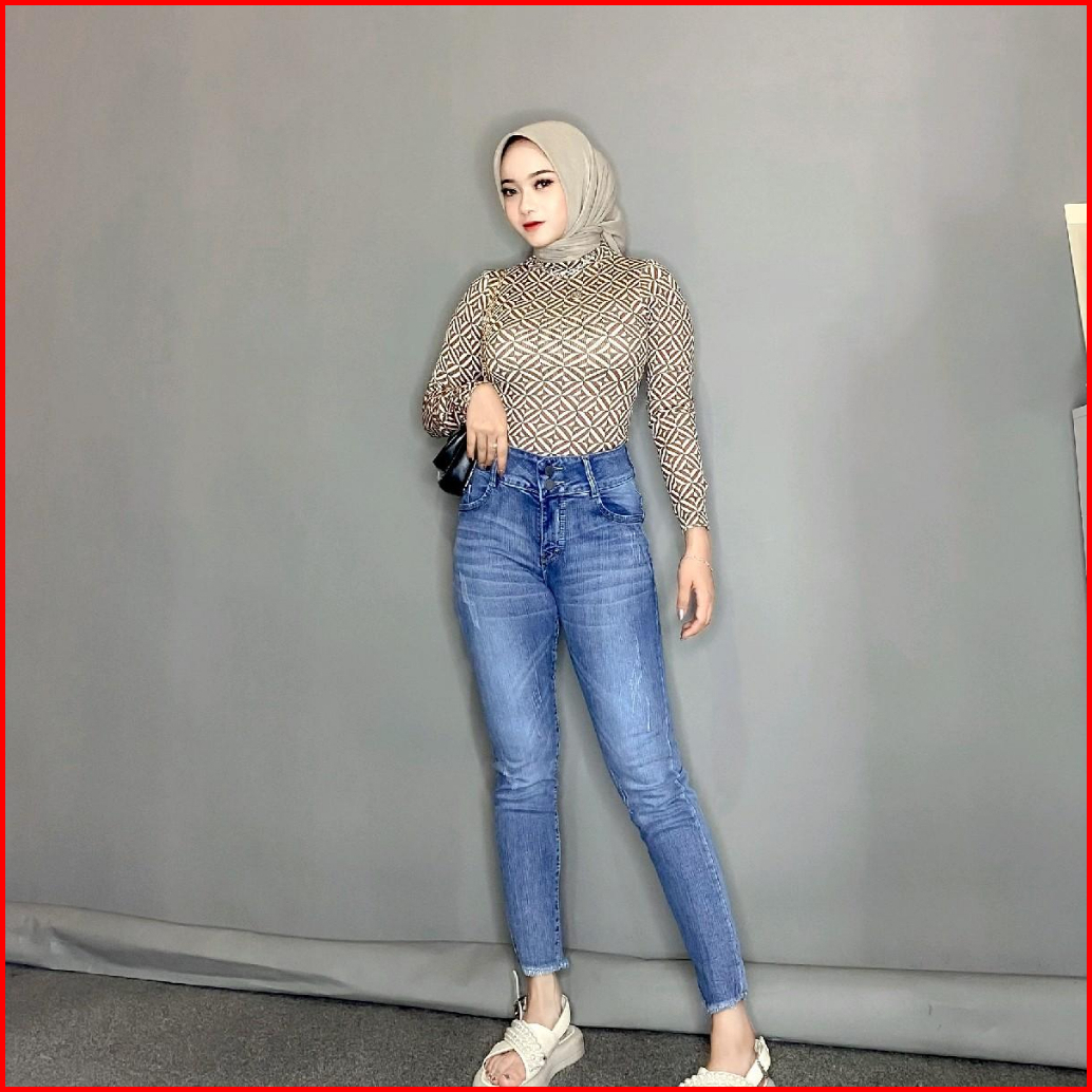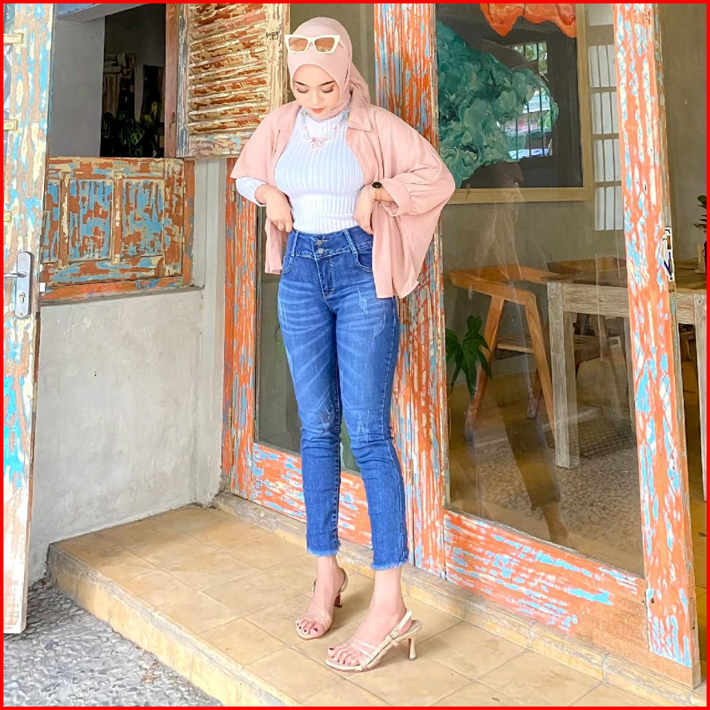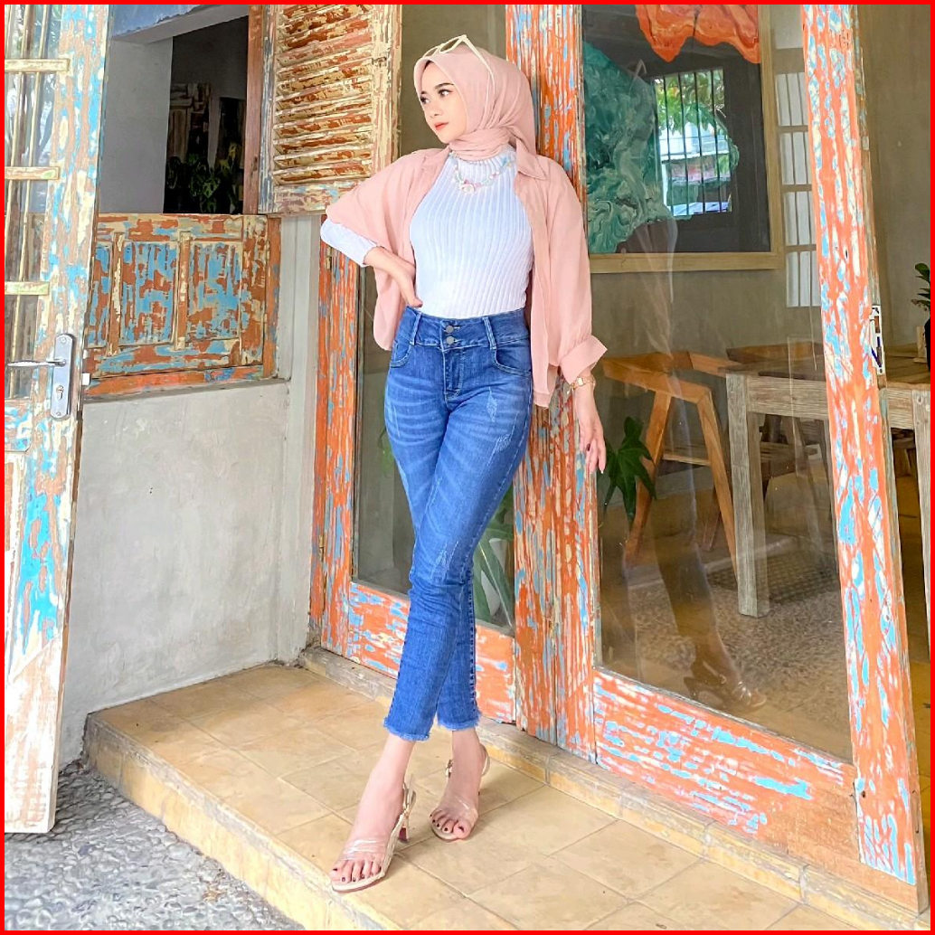 Celana Highwaist Jeans Stretch Wanita Vania Sobek Tidak Tembus Ripped Jeans Hazee
