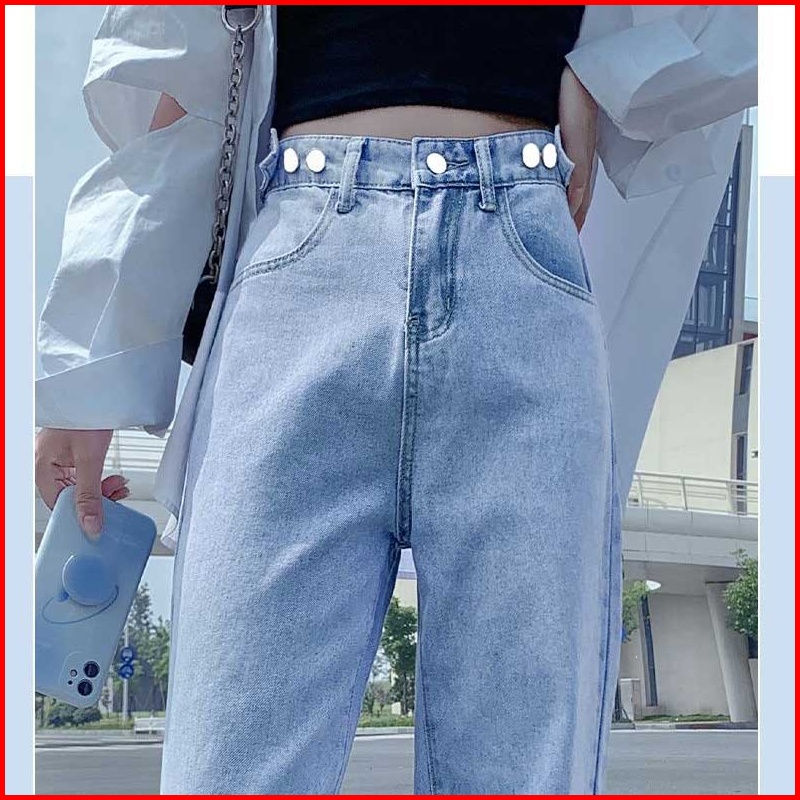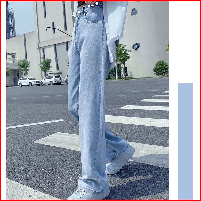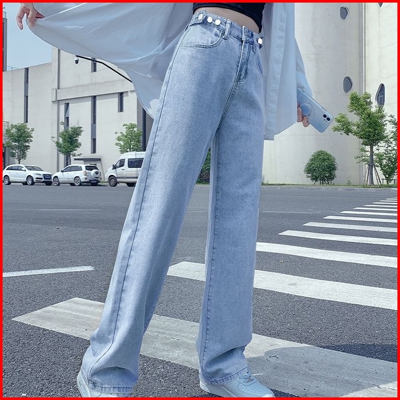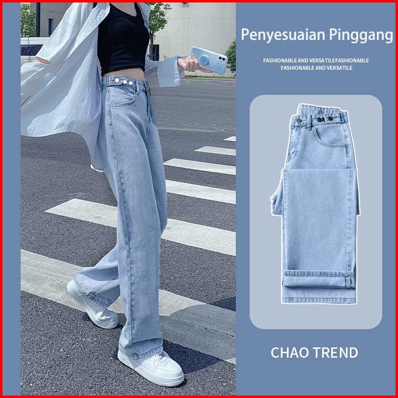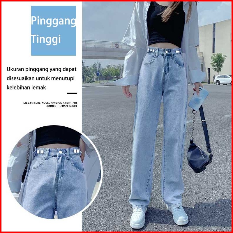 Jeans Wanita Berpinggang Tinggi Longgar Gaya Korea Lurus Berkaki Lebar
