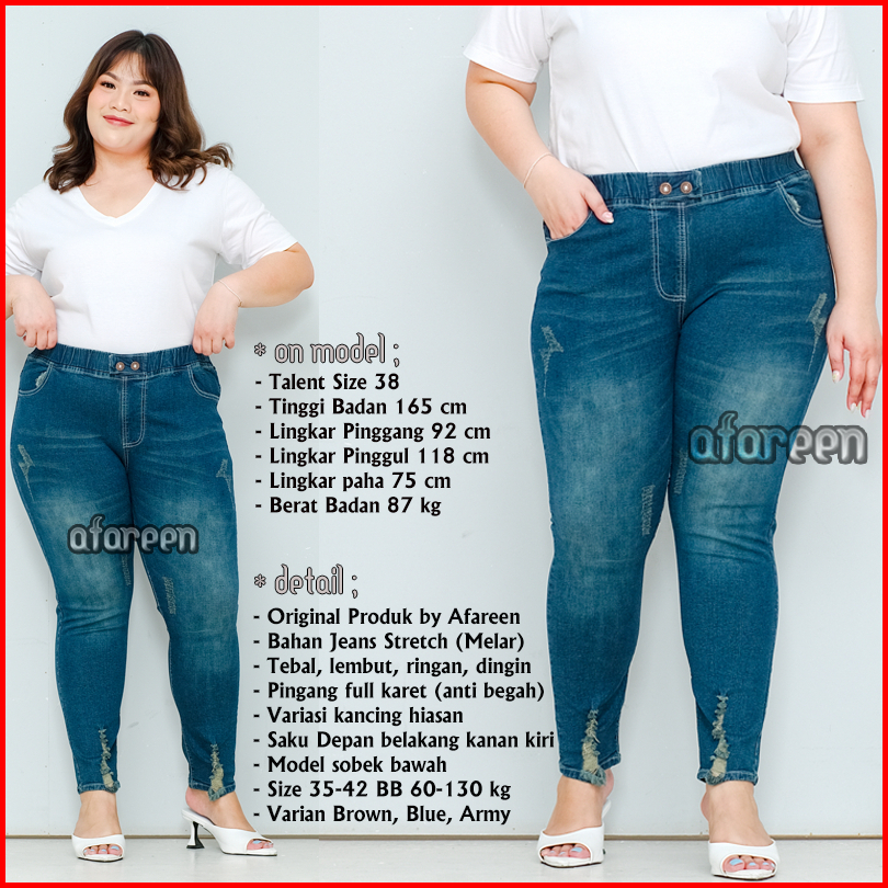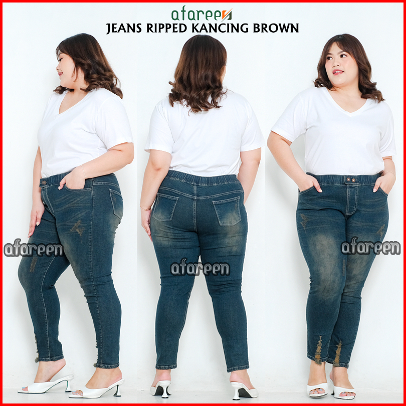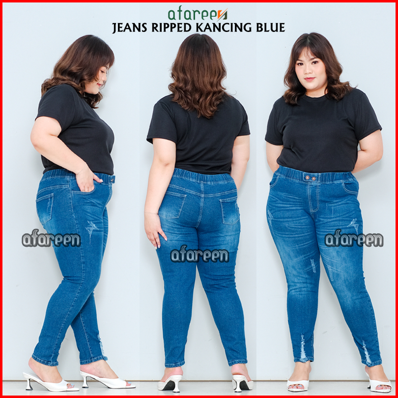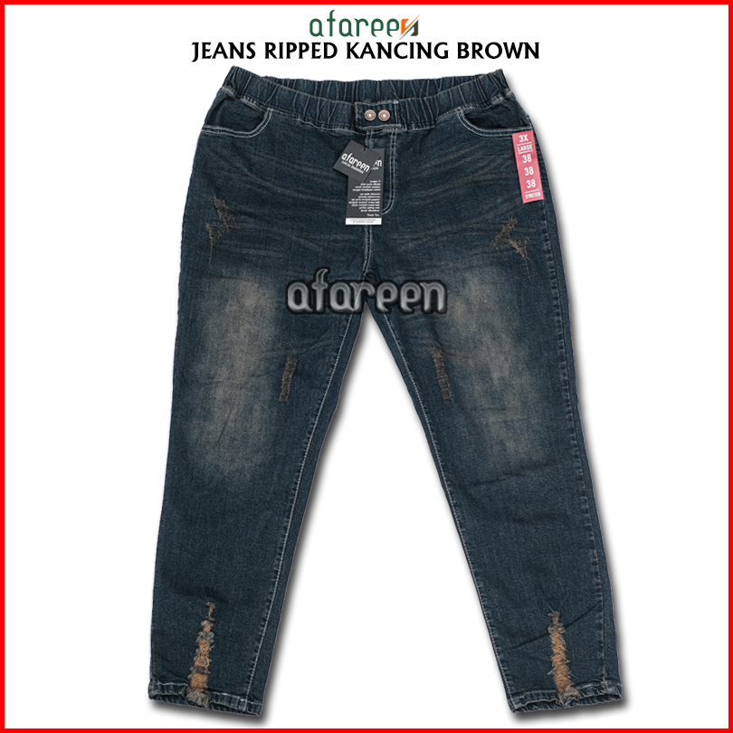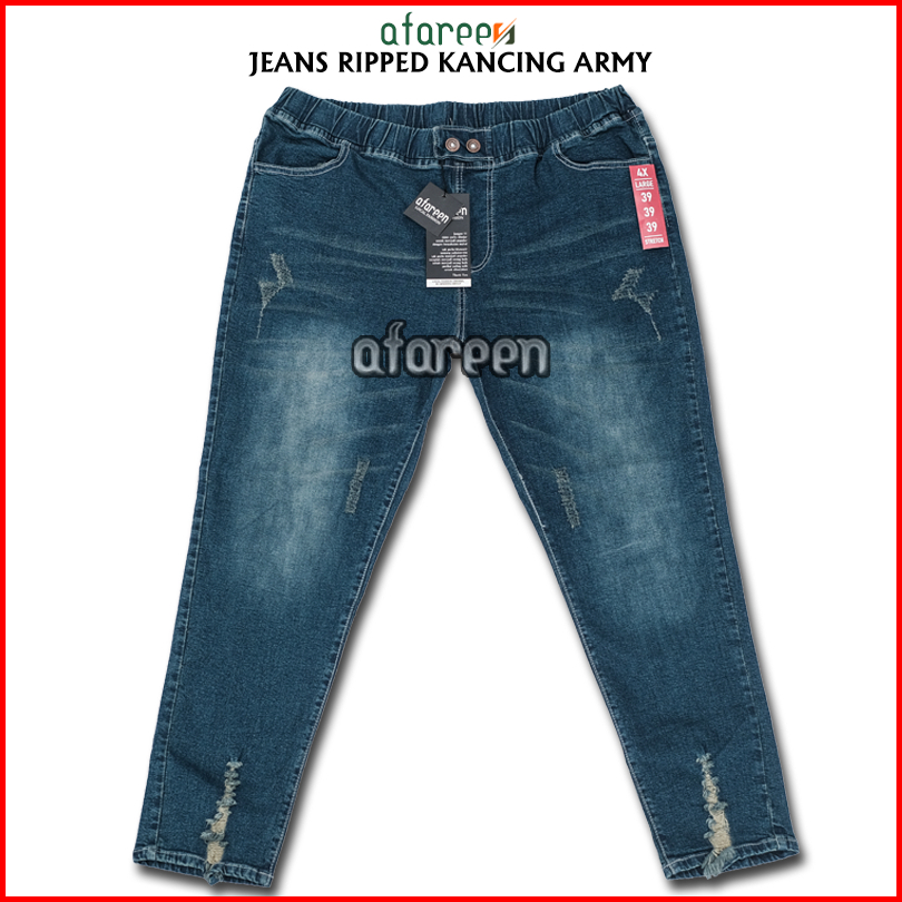Afareen - Celana Jeans Sobek Wanita Jumbo Wisker Jeans Ripped Button Jeans Pinggang Karet 35-43