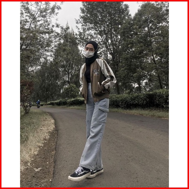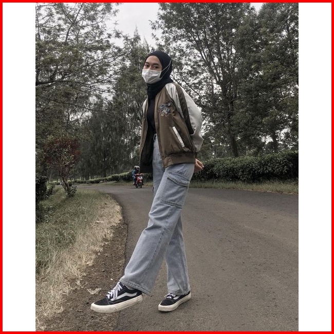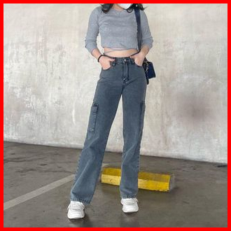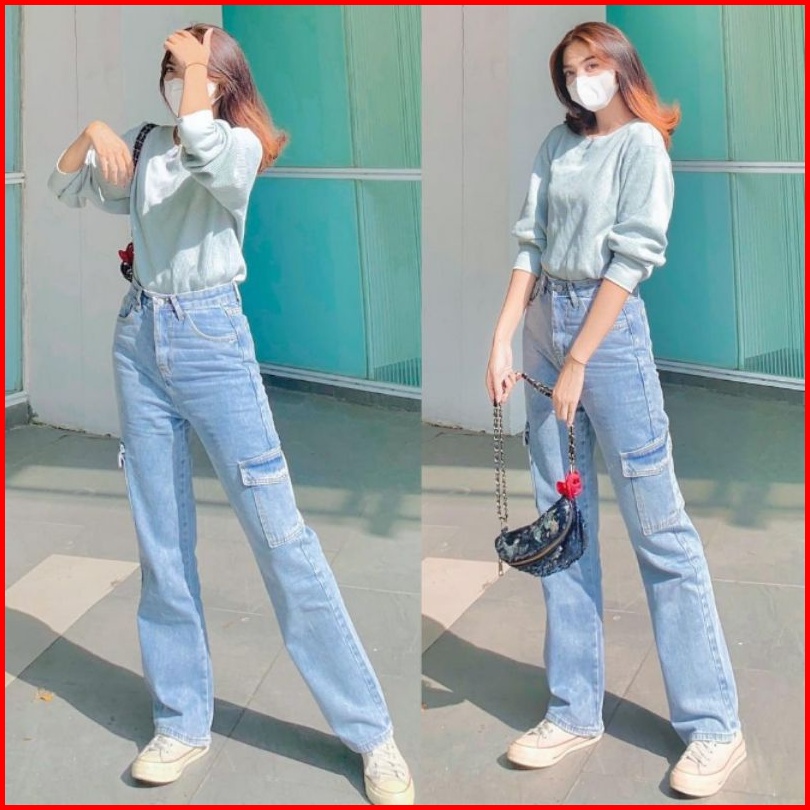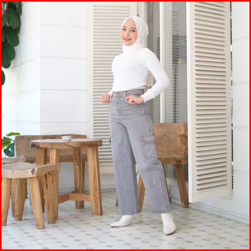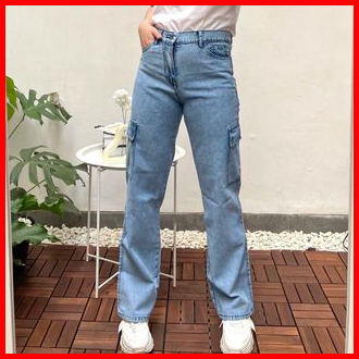 Celana Cargo Jeans Wanita Highwaist Kantong Samping Loose Cargo Cream Latte Snow Biru Kimpul