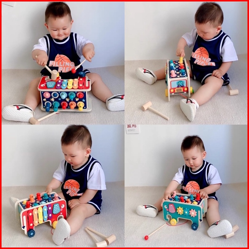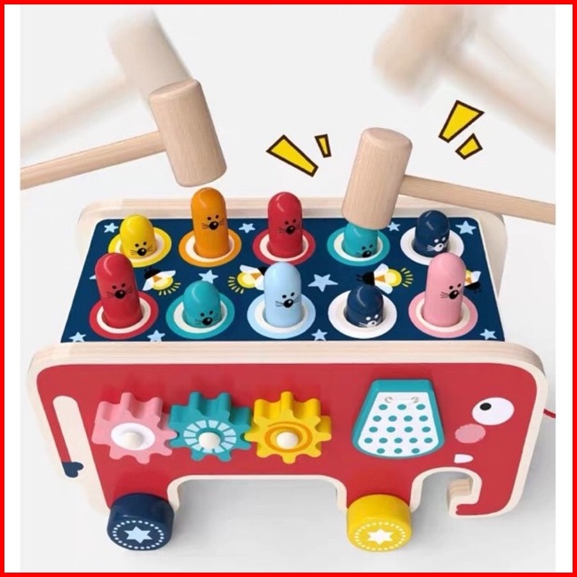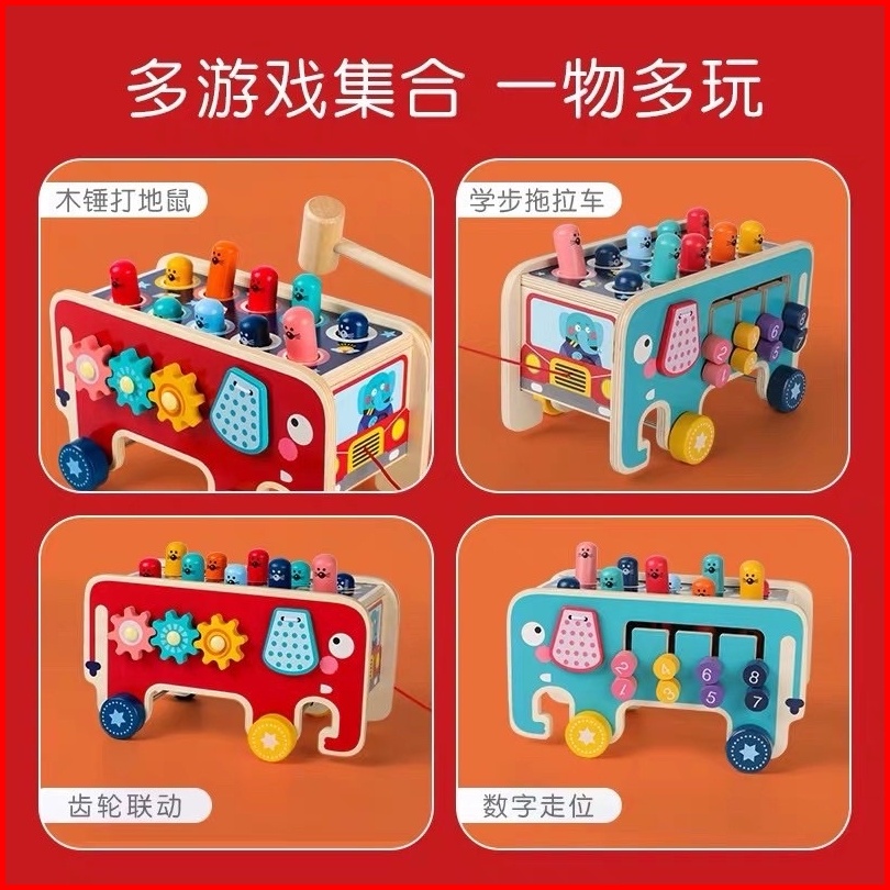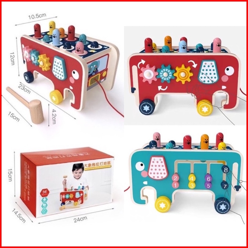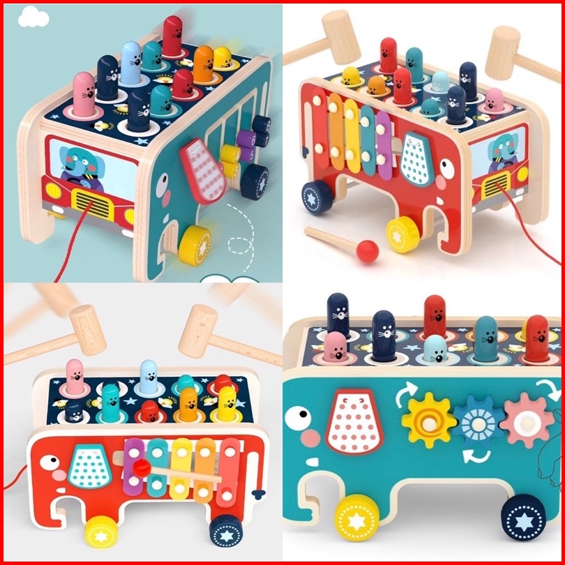Elephant Hitting Hamster Wooden Knock Toys Pull Push Truck Xylophone Mainan Edukasi Anak