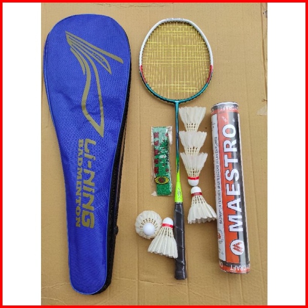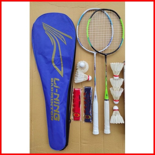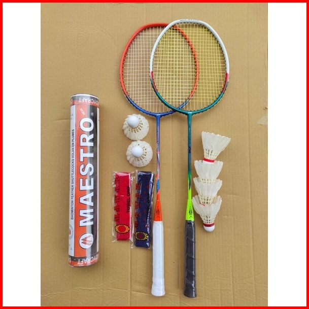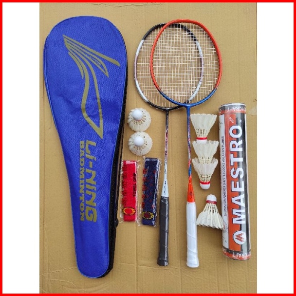 Raket Bulutangkis Lentur Murah Paket Hemat Raket Badminton 2 Raket 2 Grip 1 Tas 1 Slop Kok Isi 6 Biji