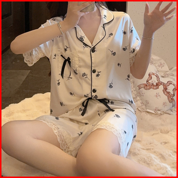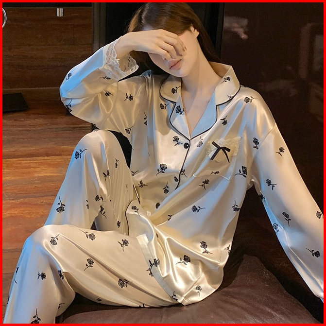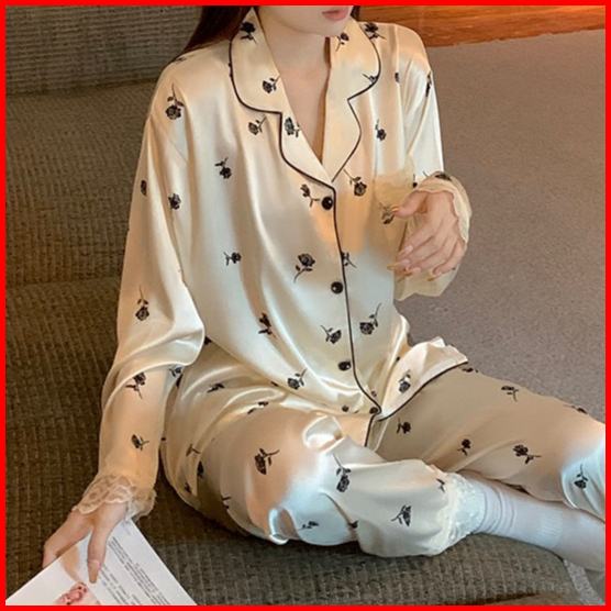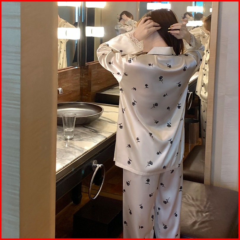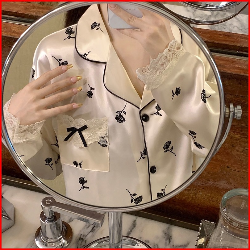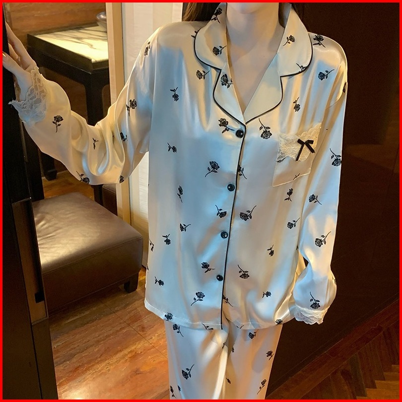 2025 Piyama Sense Premium Baru Wanita Piyama Wanita Renda Mawar Hitam Lengan Panjang Celana Panjang Loungewear
