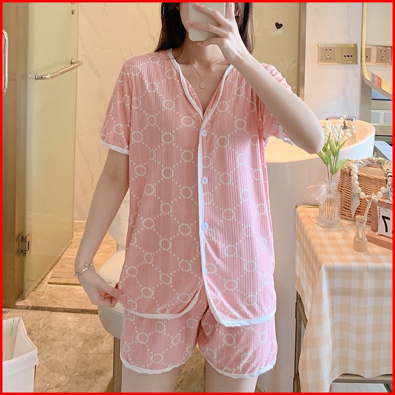 Uninice Piyama Wanita Tipis Bernapas Tiga Potong Set Pakaian Rumah Pendek Bermotif