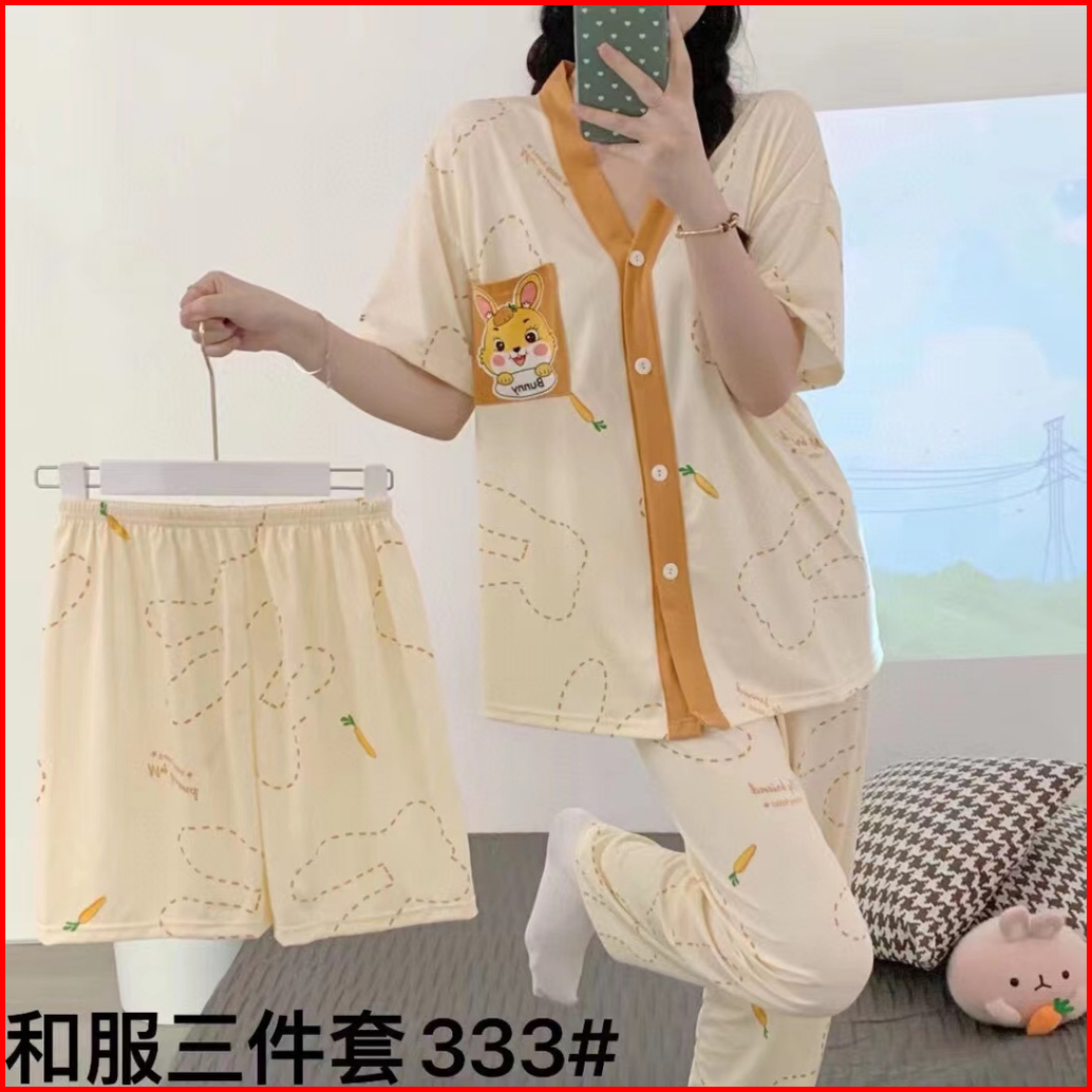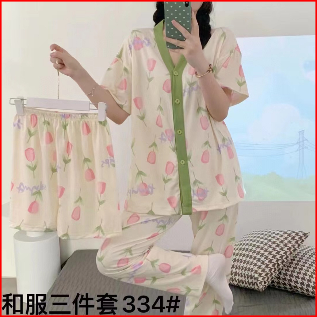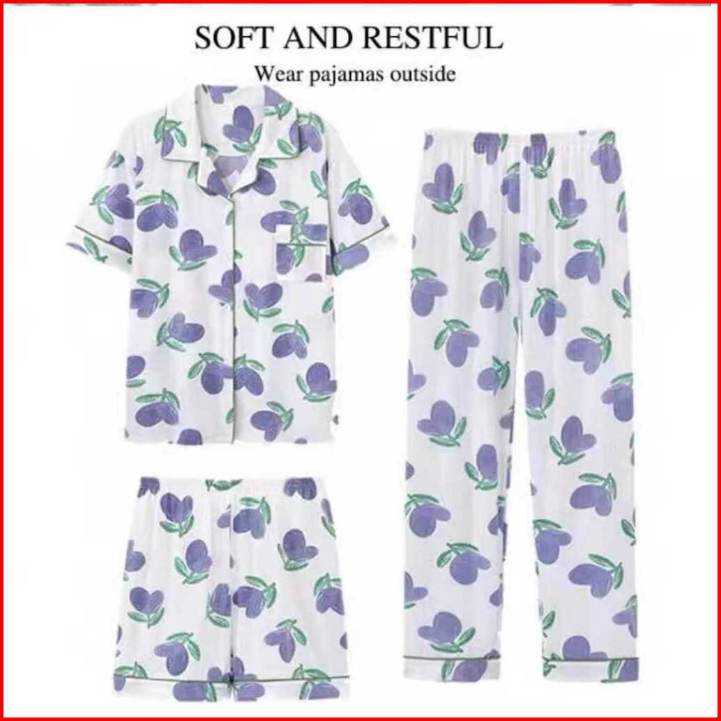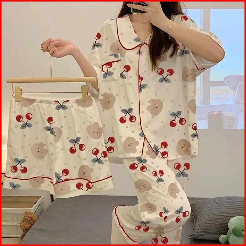 3 In 1 Stelan Baju Piyama Wanita Import Lengan Pendek Celana Panjang