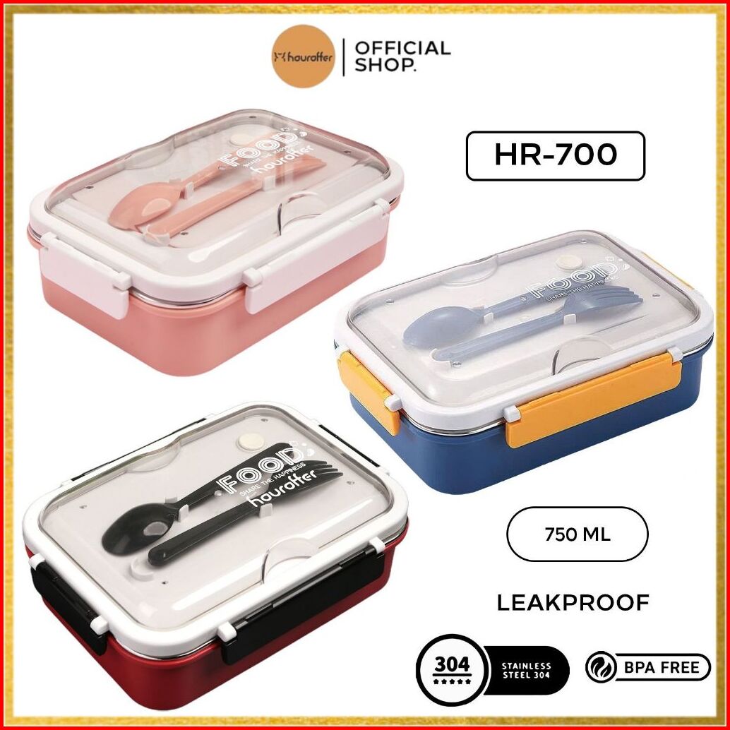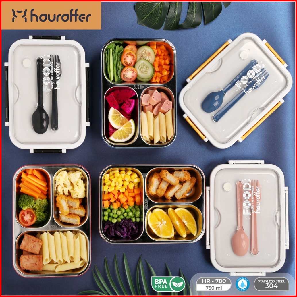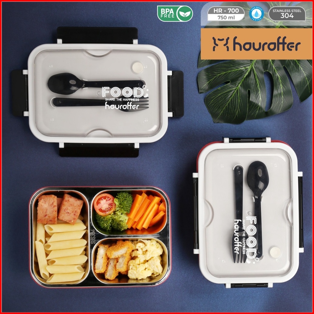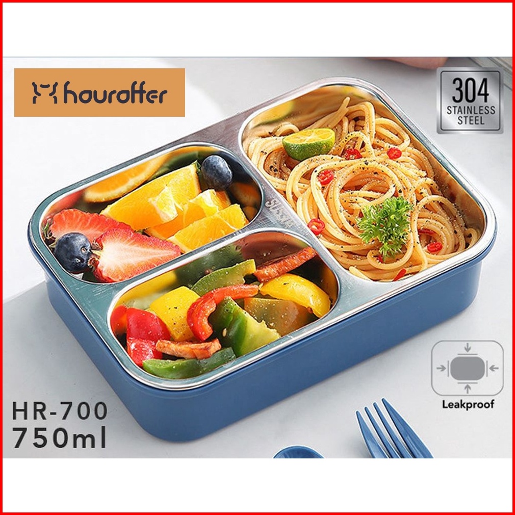 Houroffer Kotak Makan Luncbox Hr-700 Kotak Bekal 3 Sekat Anti Tumpah 750ml Include Sendok Garpu