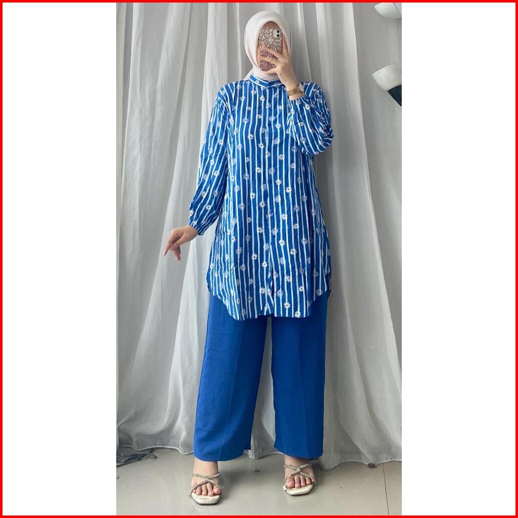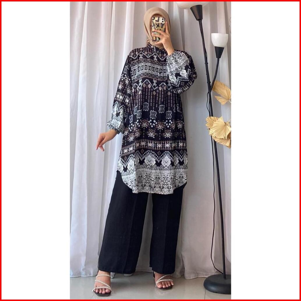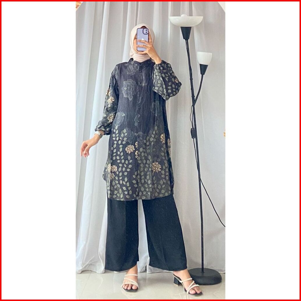 Setelan Tunik Raysha Motif Rayon Mix Crinkle Outfit Wanita Mode Kekinian Insprirasi Outfit Wanita