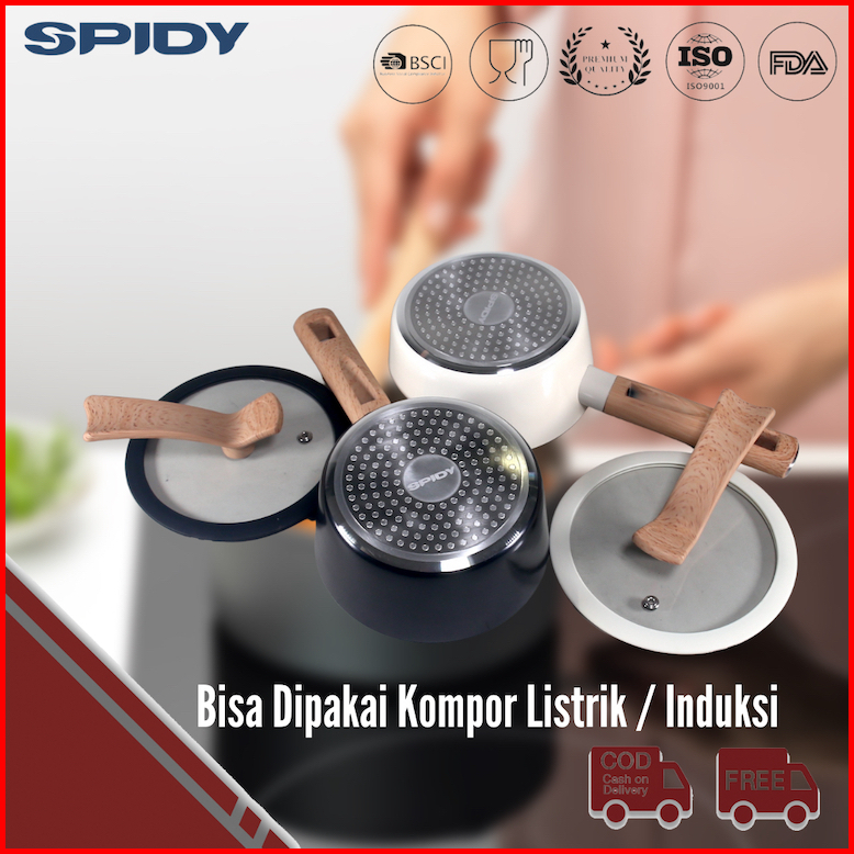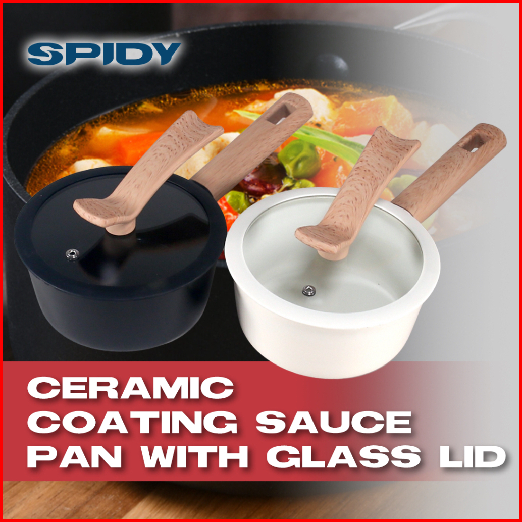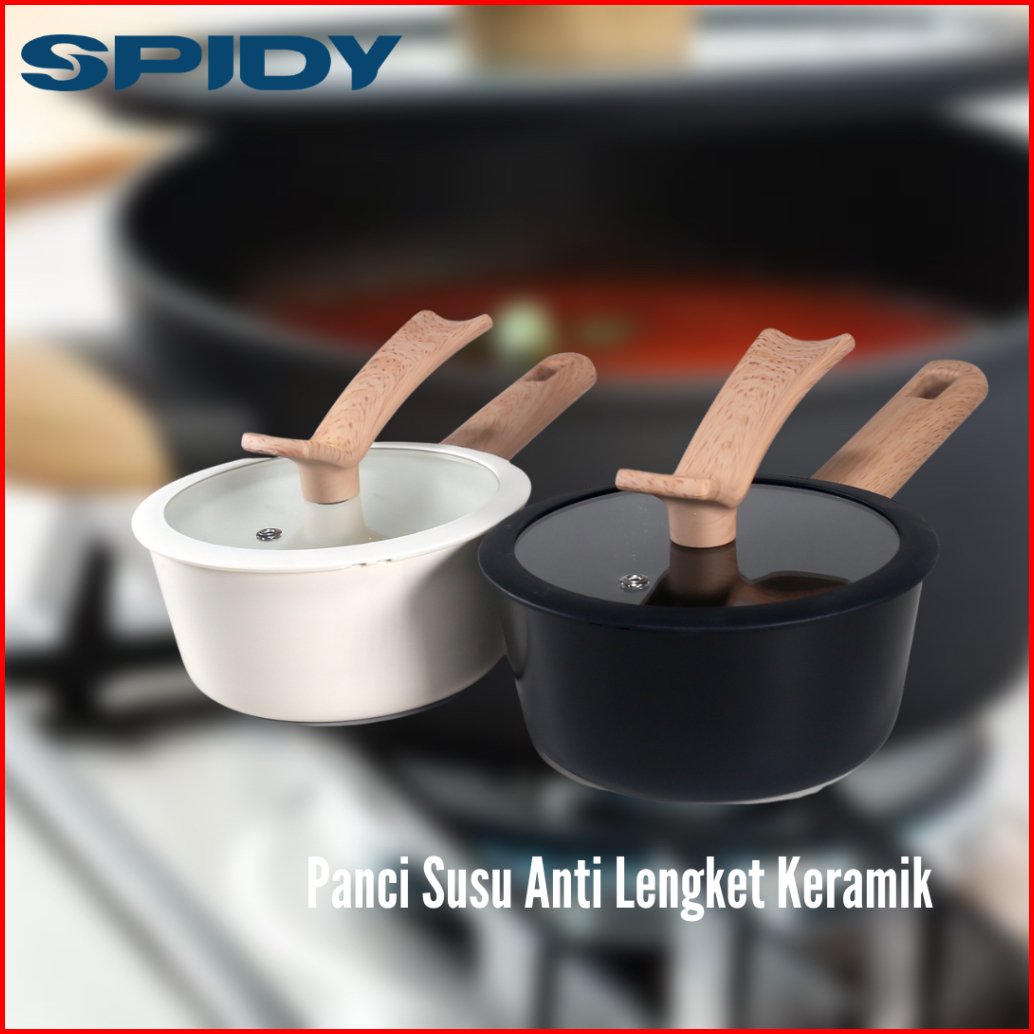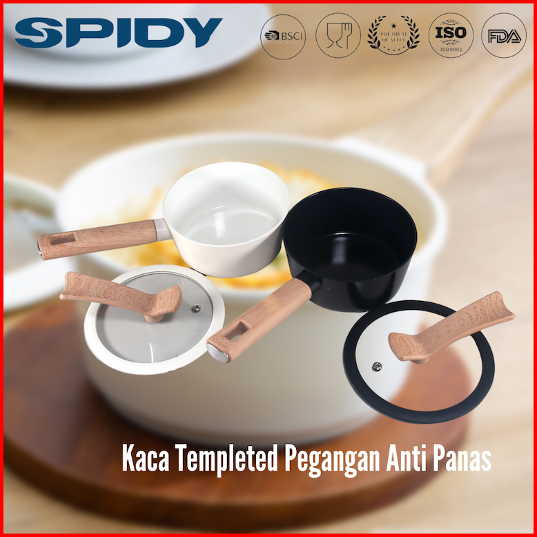 Spidy Panci Susu Granit Anti Lengket Tebal Induksi 16cm Tutup Kaca Templeted Gagang Kayu