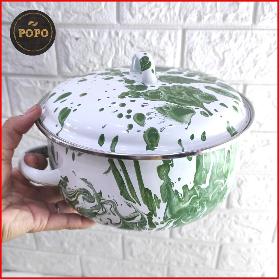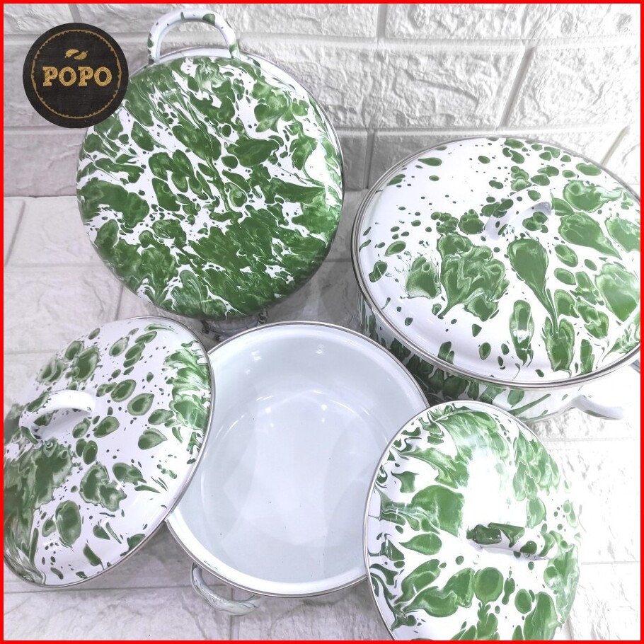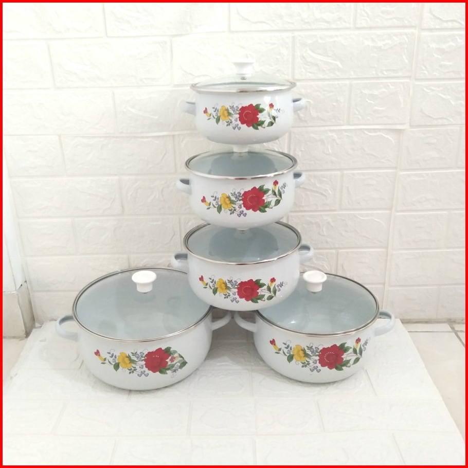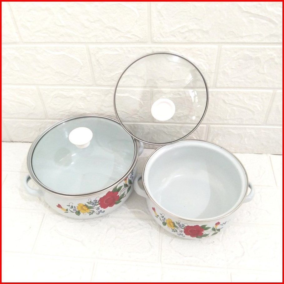 Panci Enamel Kembang Putih Tutup Kaca 16 18 20 22 24 Set Panci Jadul