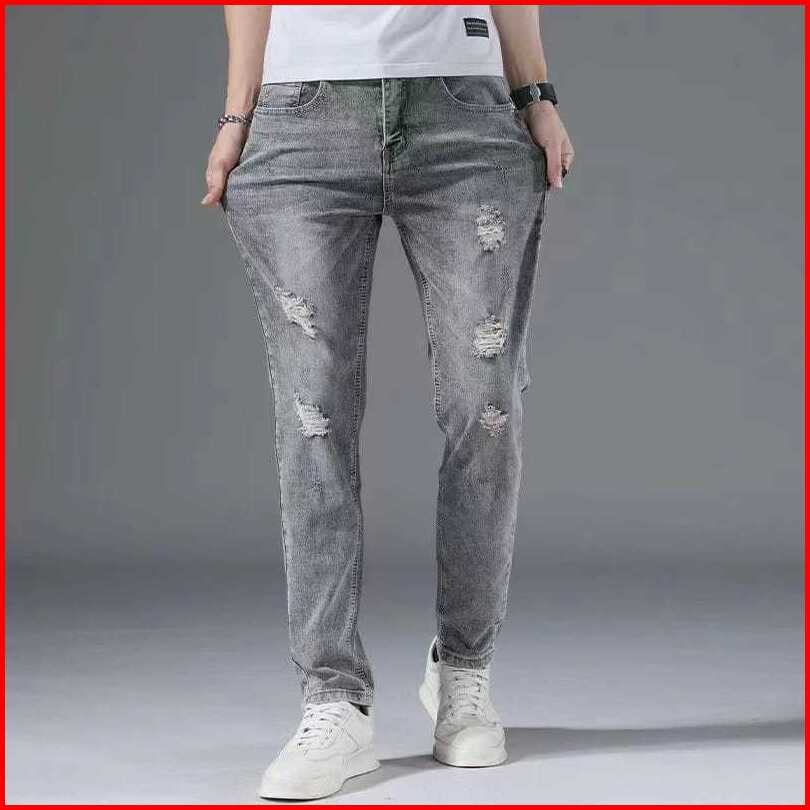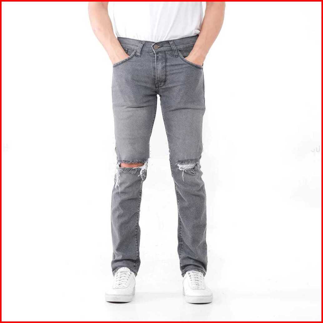 Celana Jeans Pria Sobek Abu Grey Slimfit Stretch Panjang Cowok Ripped Celana Denim Dewasa Robek Skinny Pensil Korea Styl