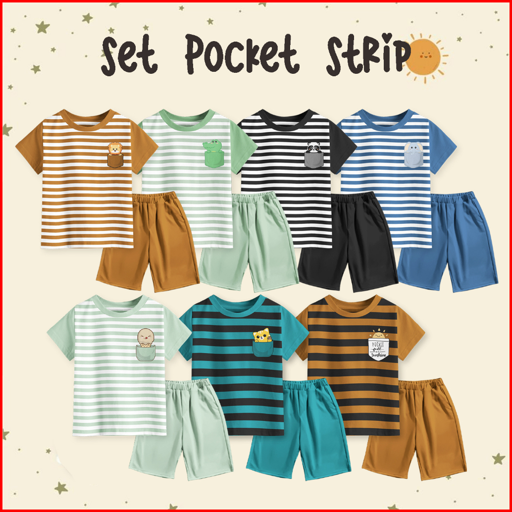 Setelan Kaos Salur Strip Anak Laki-laki Dan Perempuan Setelan Kaos Lengan Pendek Dan Celana Pendek Motif Pocket Series