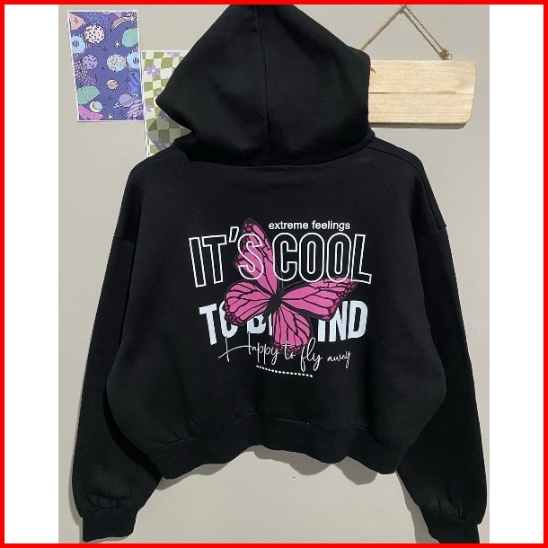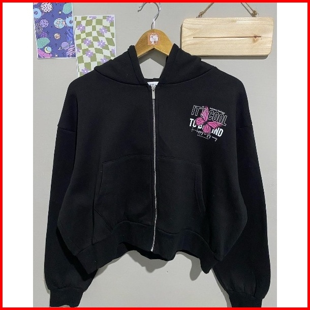 Pink Butterfly Jacket Sweater Crewneck Hoodie Zipper Crop Wanita Kekinian Fashion Outfit Ootd Korean Style Baju Atasan J