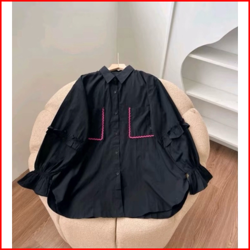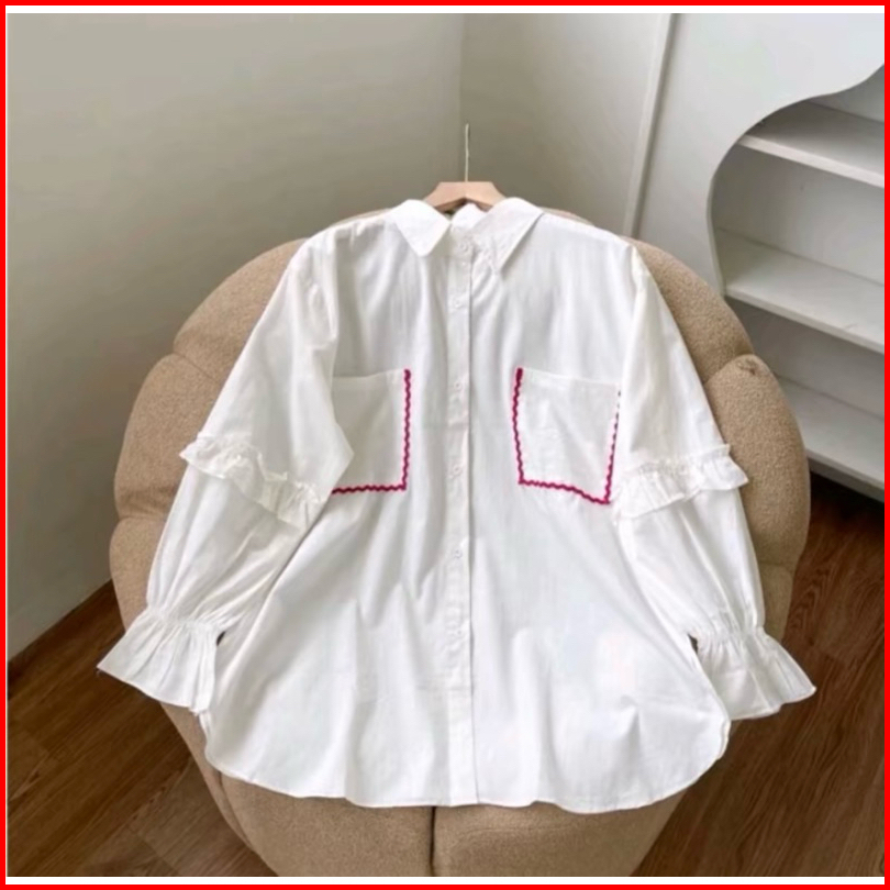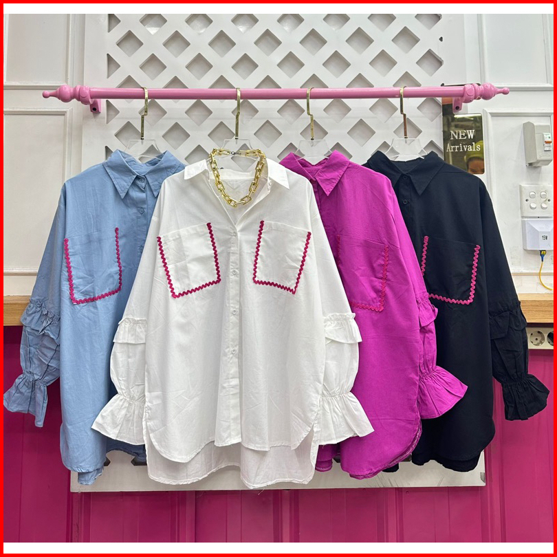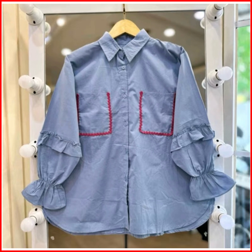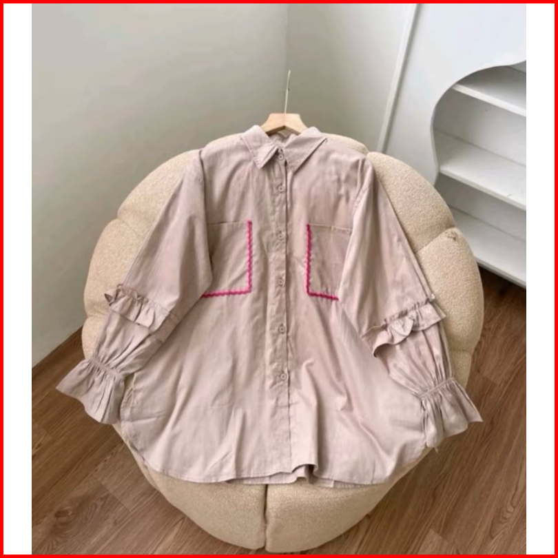 Kemeja Haiya Oversize Atasan Kekinian Motif Renda Lucu Kancing Depan Busui