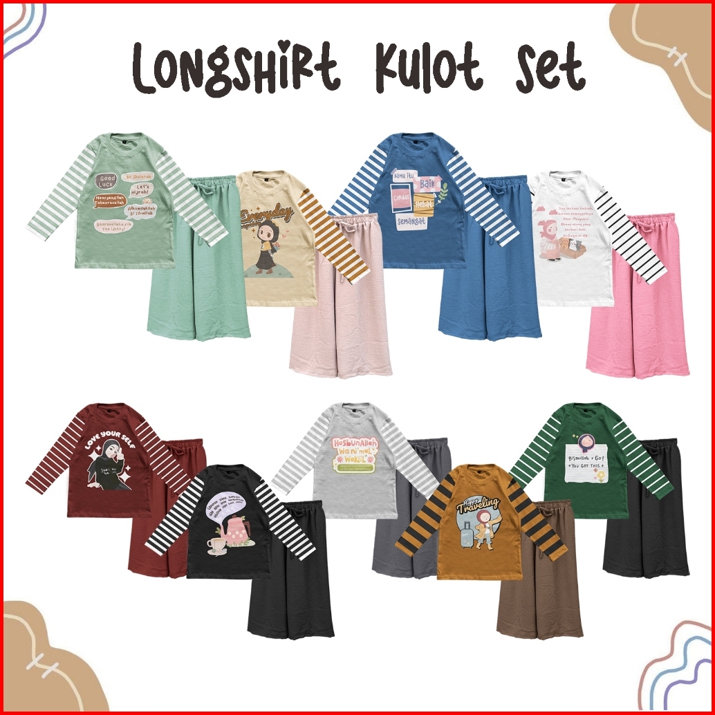 BaikCerdasKulotDenim, TekoKulotHitam, RezekiLuasKulotAbu, HappyTrvelKulotBrown, GoodDayKulotMocca, BismilahGoKulotHitam, BeSholehahKulotSage, LoveSelfKulotMarun, BerbuatBaikKulotPink, SetTopSbrinaNalaPita