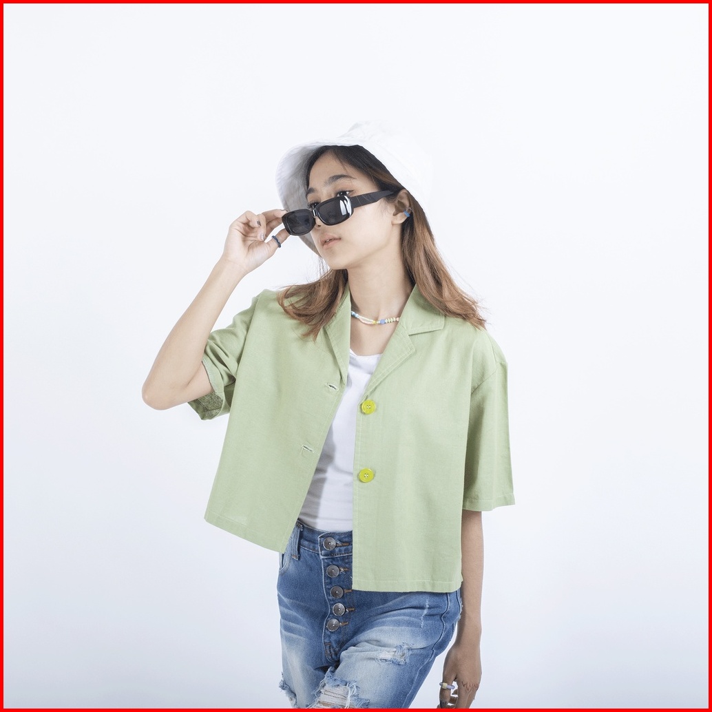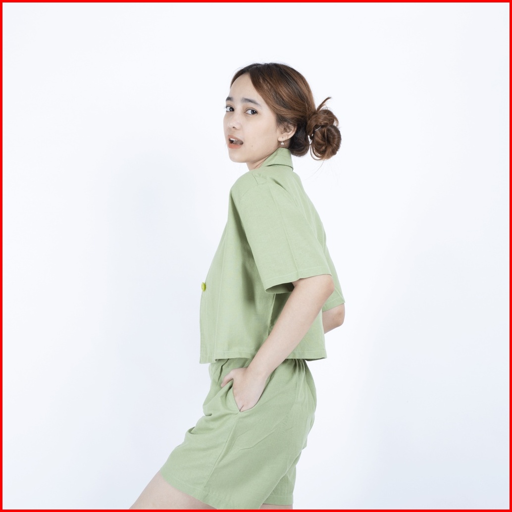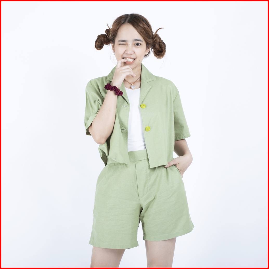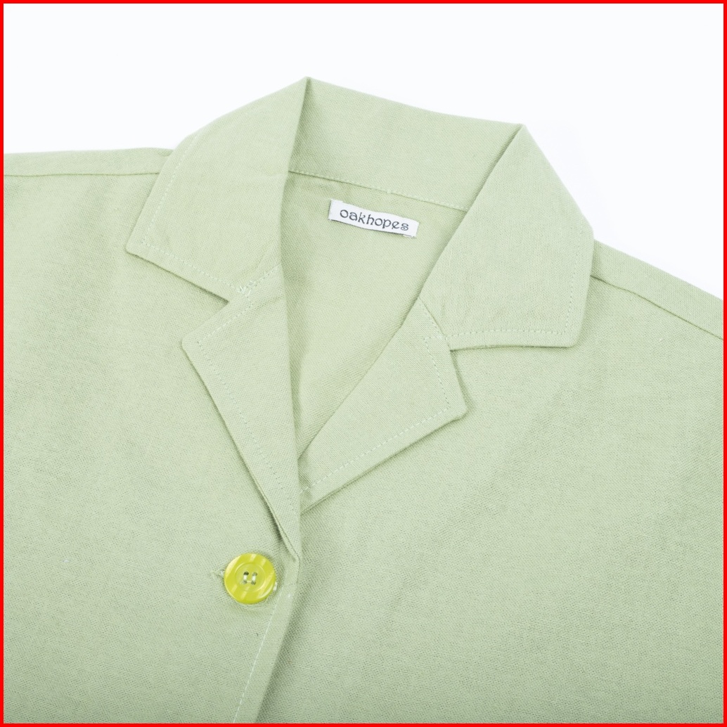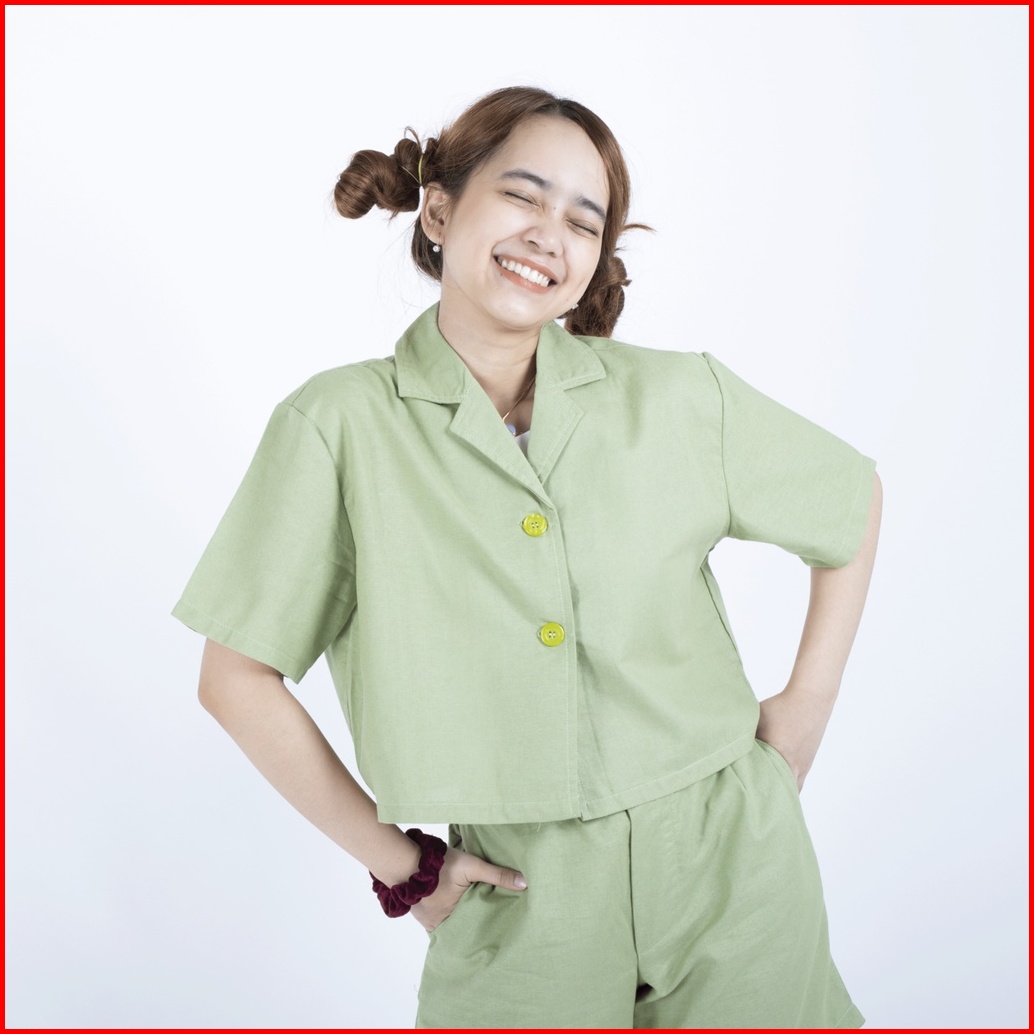 Oakhopes - Kemeja Linen Wanita - Crop Top Blazer Korea - Green