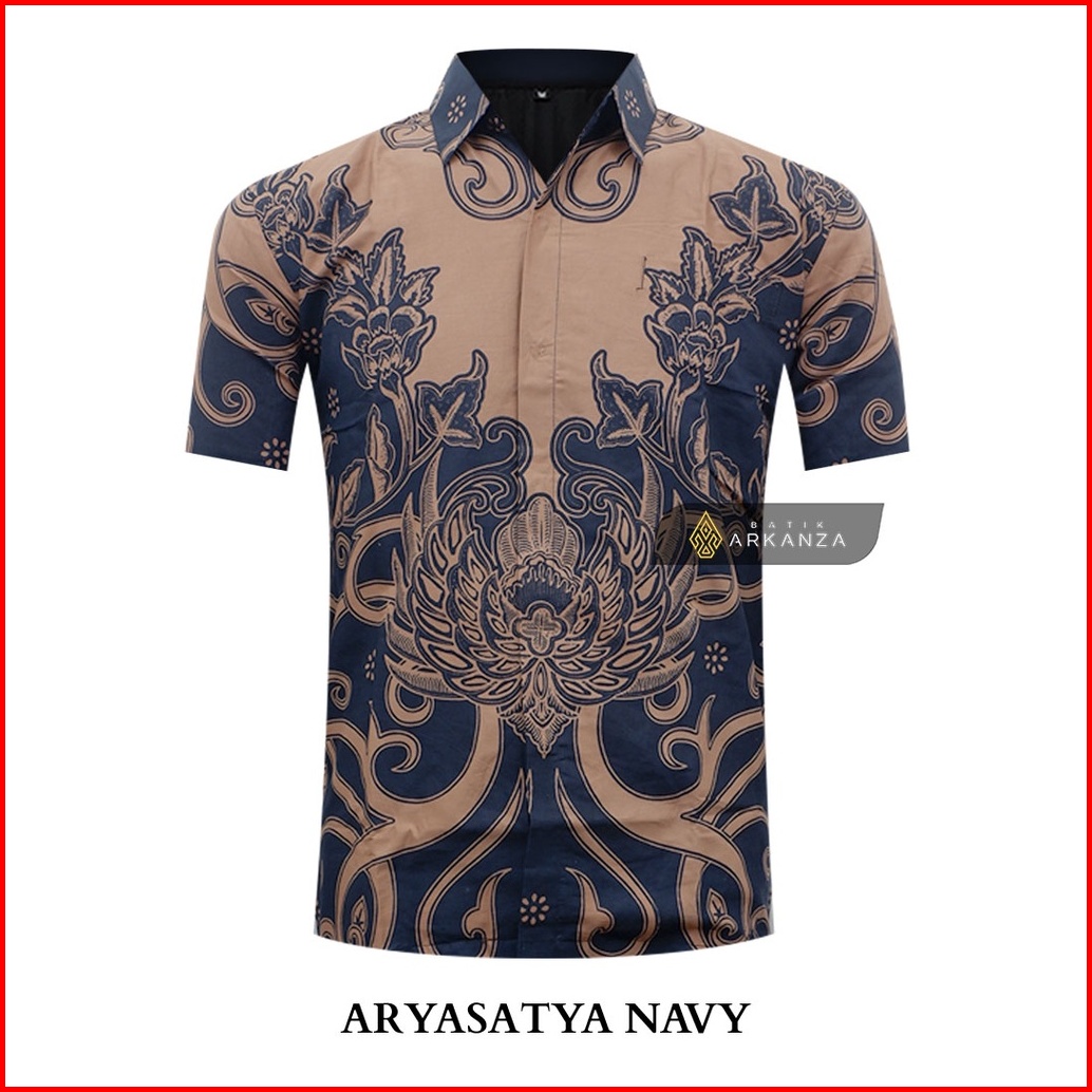 Batik Arkanza Motif Aryasatya Navy Hem Atasan Kemeja Baju Batik Pria Cowok Laki Laki Slimfit Full Lapis Furing Lengan Pa