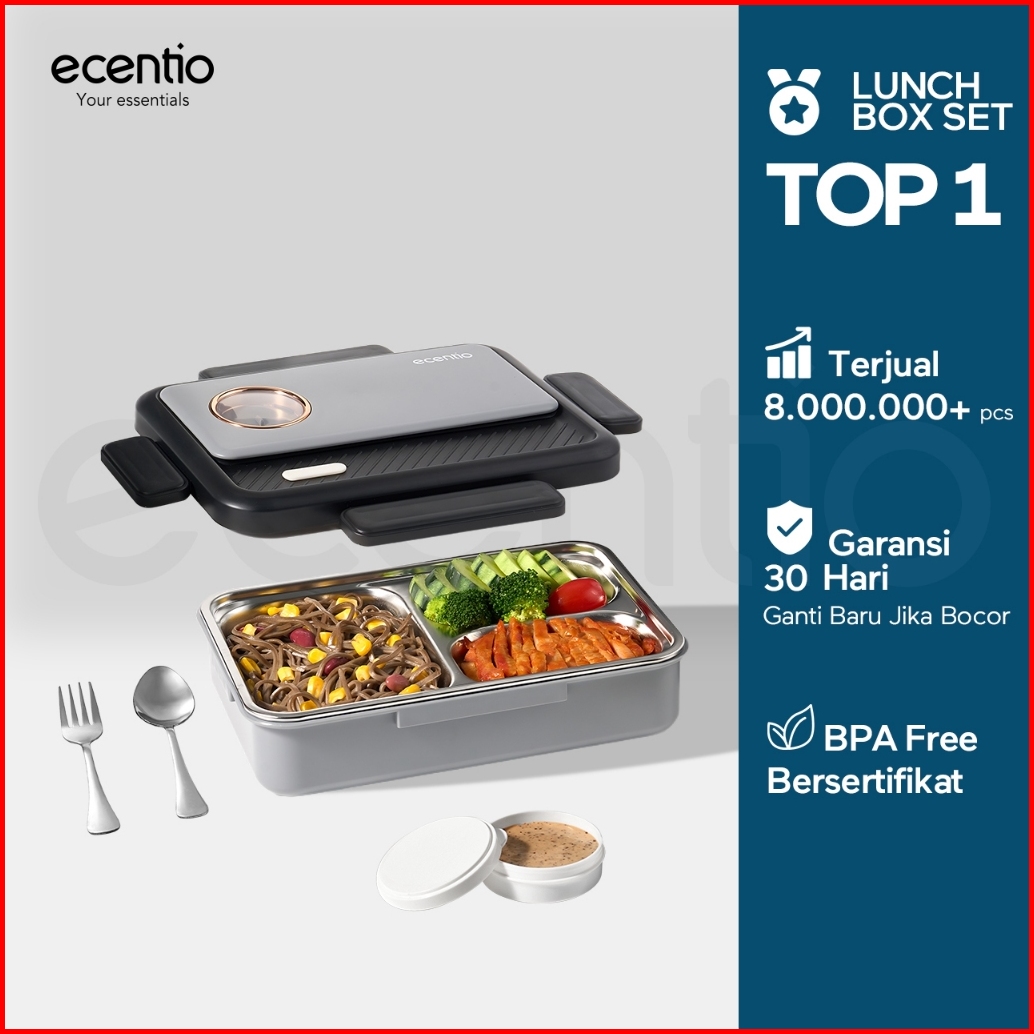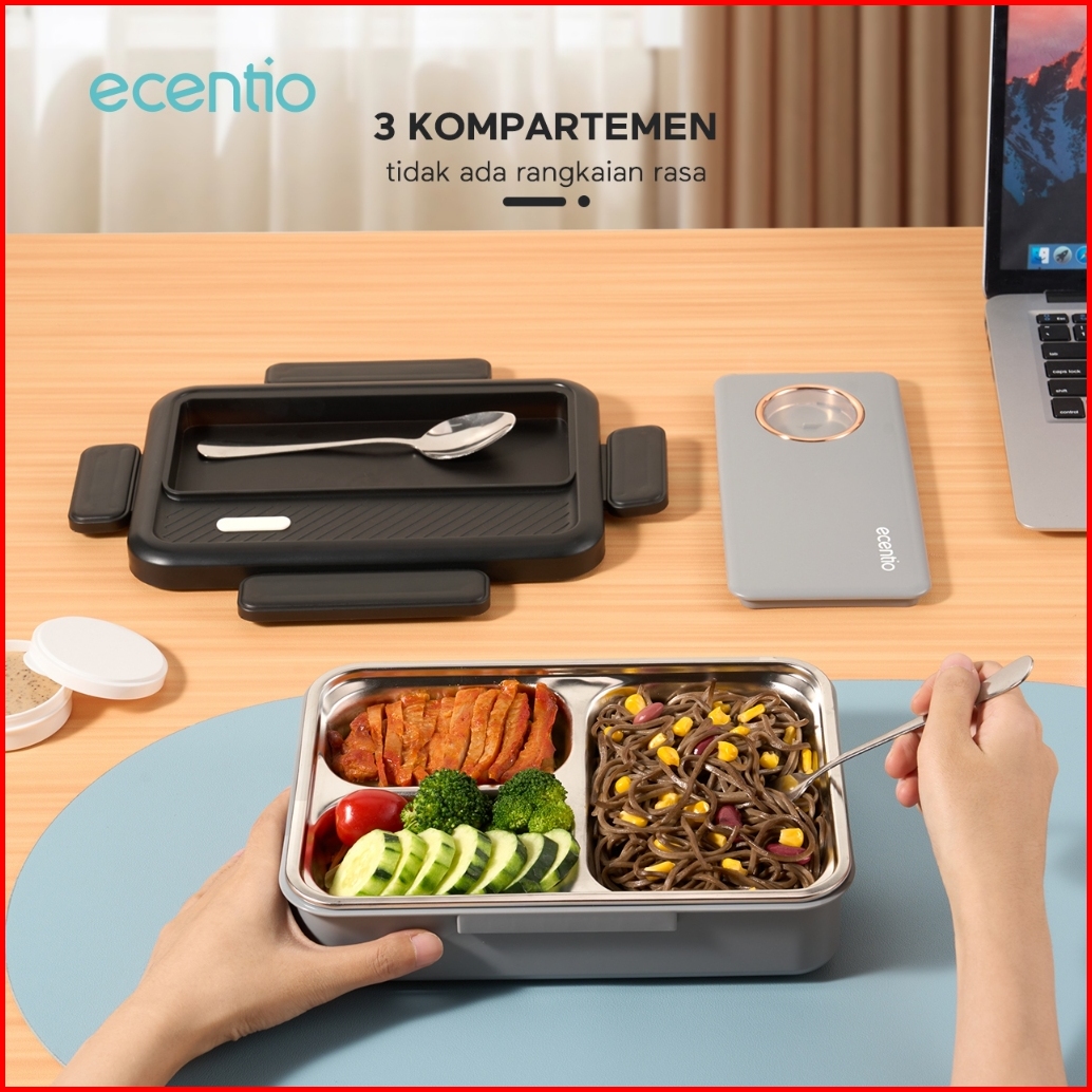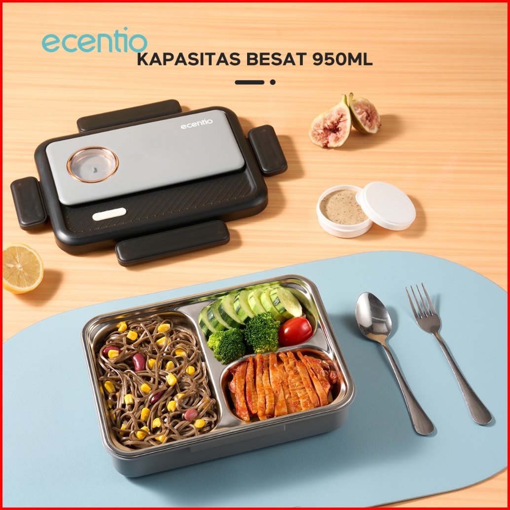 1.0 Anti Tumpahecentio Tempat Makan Stainless 3 Sekat 950ml Kotak Bekal Lunch Box Tahan Panas Anti Bocor Hitam Abu-abu