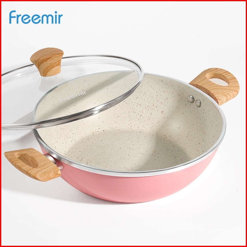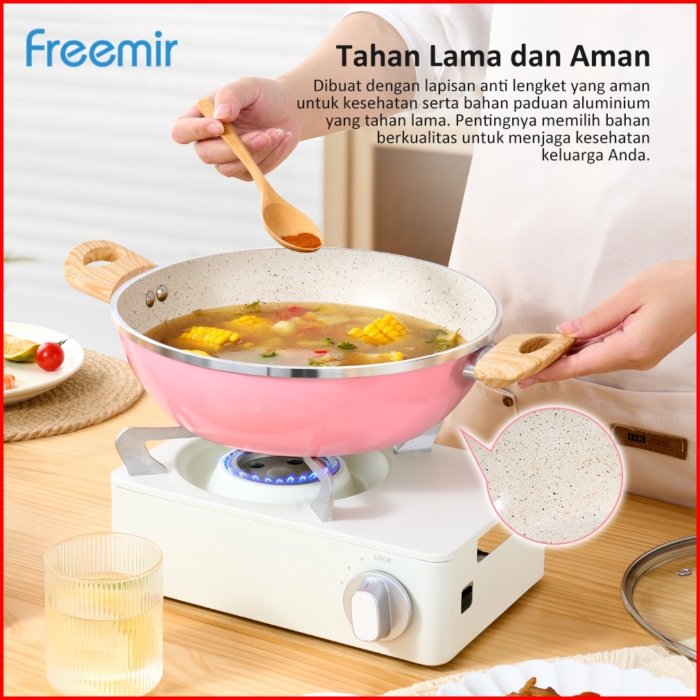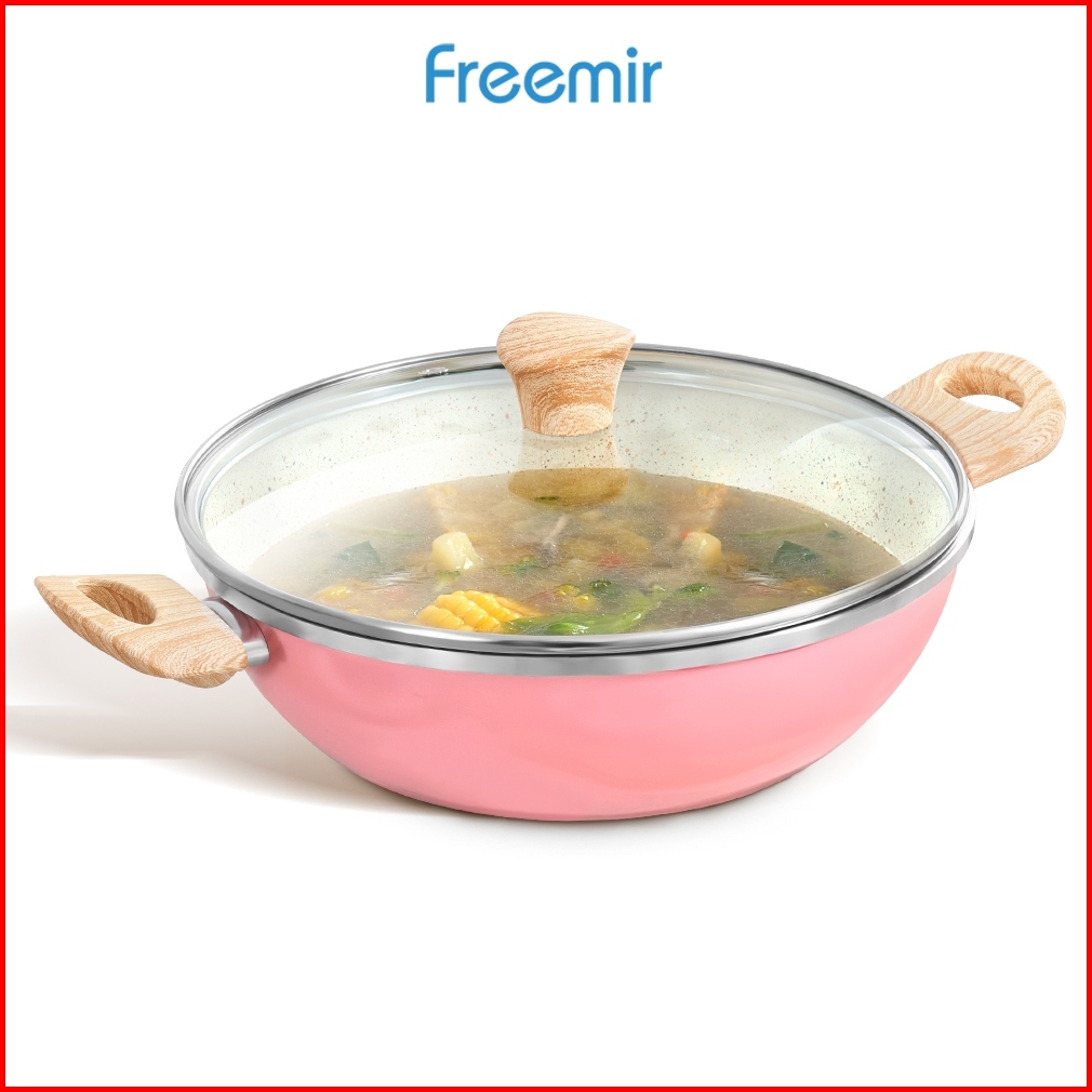 New Wajan Panci 26 Cm Penggorengan Anti Lengket Tutup Kaca Pink Gagang Kayu Double Bottom Kompor Induksi Listrik