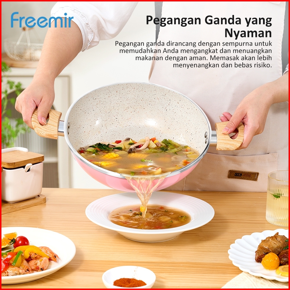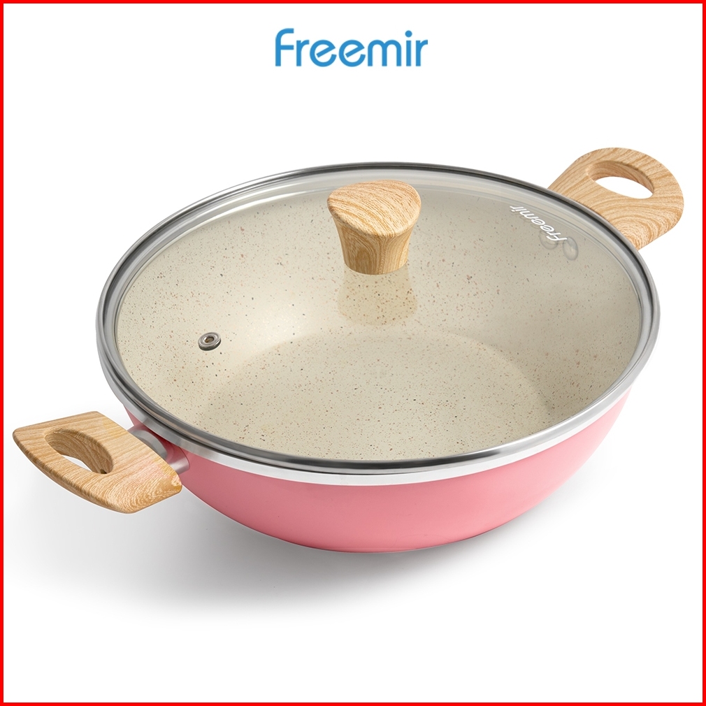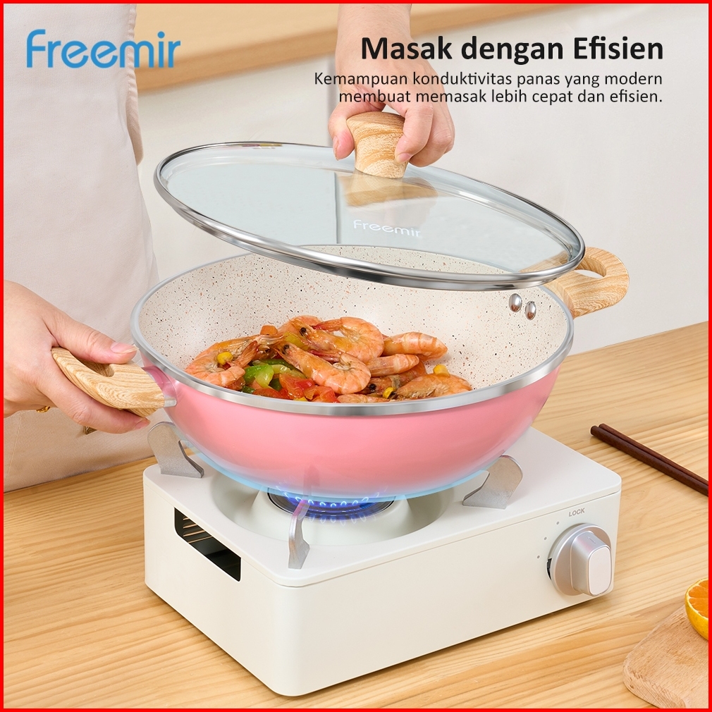 New Wajan Panci 26 Cm Penggorengan Anti Lengket Tutup Kaca Pink Gagang Kayu Double Bottom Kompor Induksi Listrik