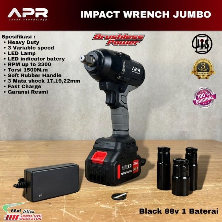 Apr Japan Jumbo 1500NM Mesin Impact Wrench 88V Black Edition Buka Baut bat-erai Listrik Komplit Original