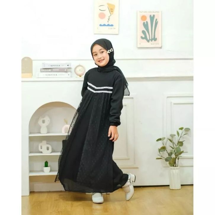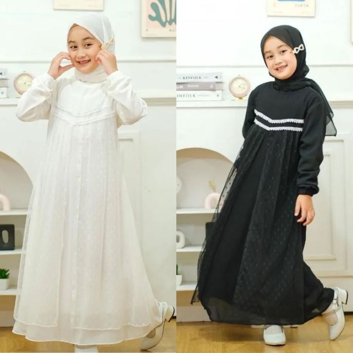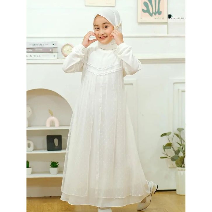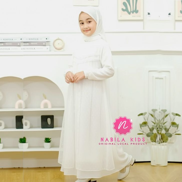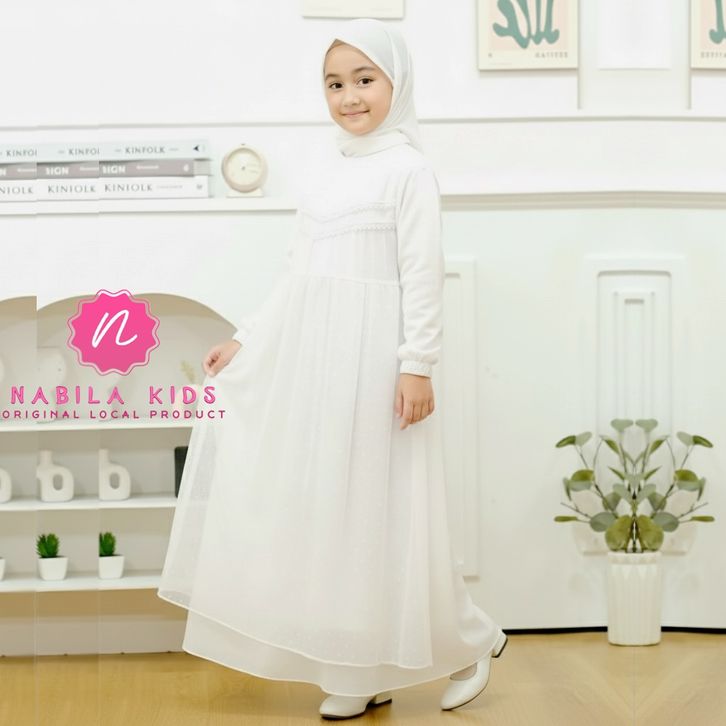 Gamis Putih Set Hijab Pasmina Nabila Kids untuk anak usia 4-12 tahun Gamis Lebaran 2026