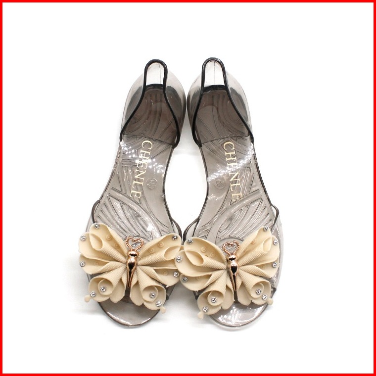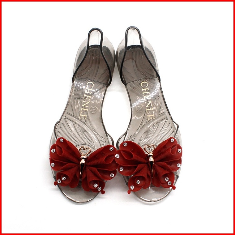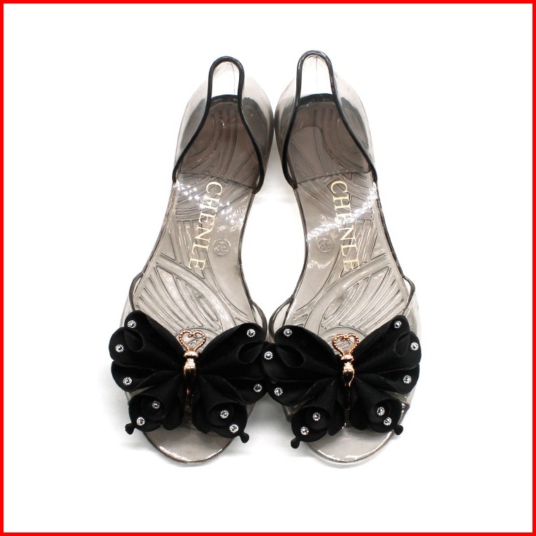 Ready Sandal Wanita Manis Transparan Kristal Busur Mulut Ikan Datar Sepatu Jelly Non-slip