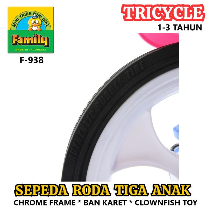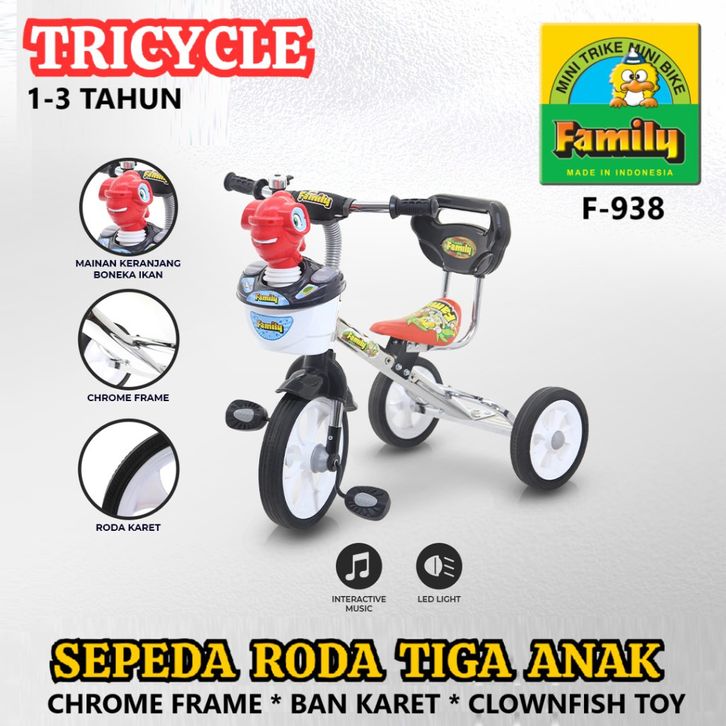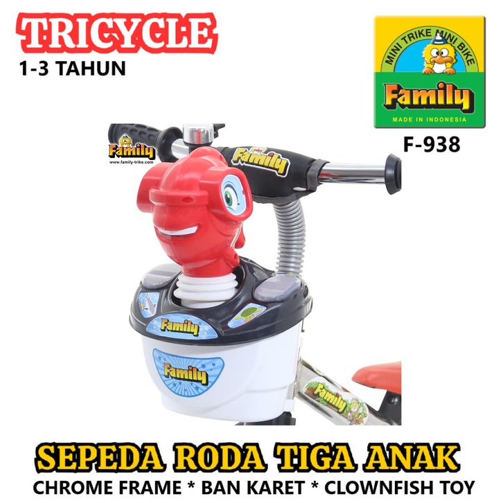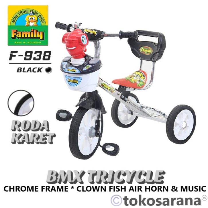 Sepeda Roda Ta Anak Family F938 Nikel Krom Ban Karet Clownfish Music & Airhorn BMX Baby Tricycle New