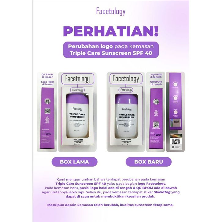 FACETOLOGY Triple Care Sunscreen 40ML PACKAGING BARU SHIELDTAG Hybrid Tanpa Parfum Scentless UVA UVB Terlaris