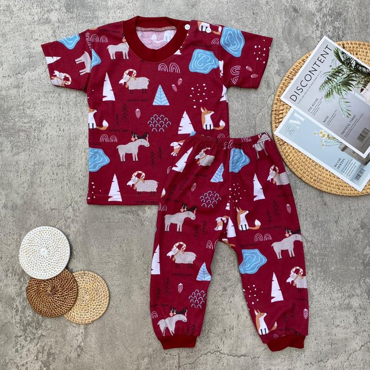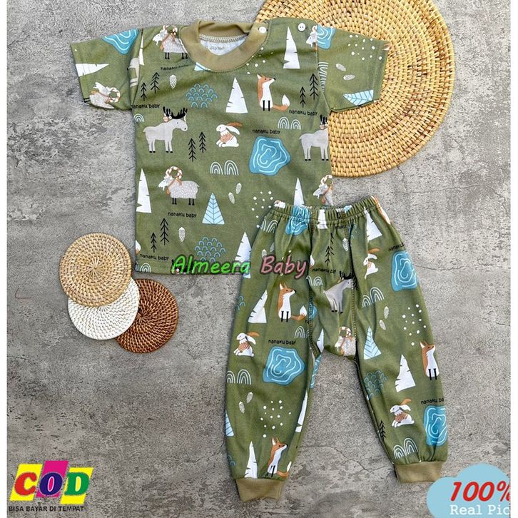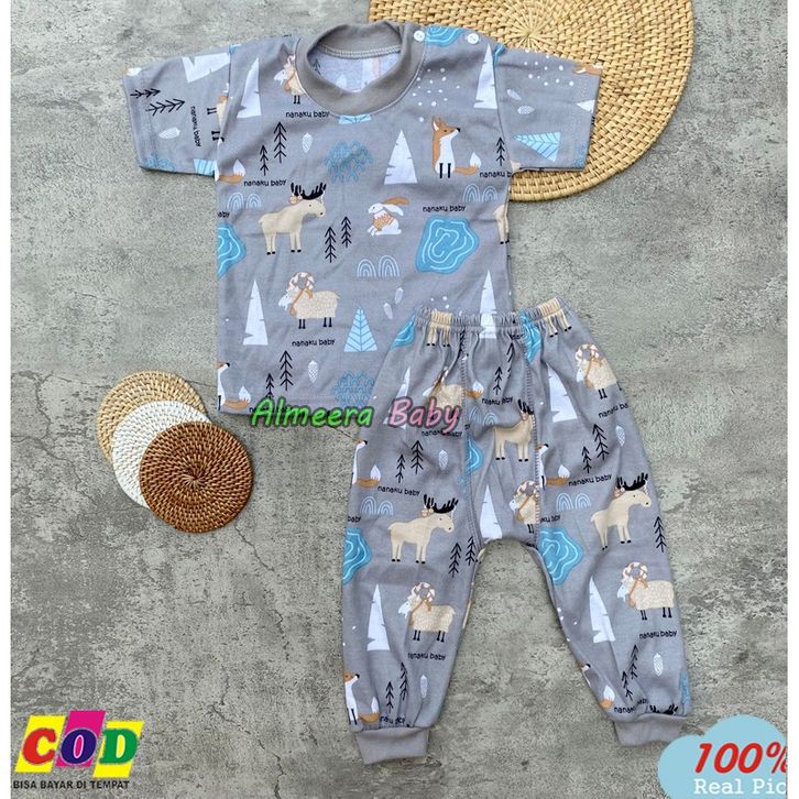 Setelan Baju Bayi Piyama Bayi Lengan Pendek Celana Panjang Kancing Pundak Motif Printing Rubah Usia 3-12 Bulan