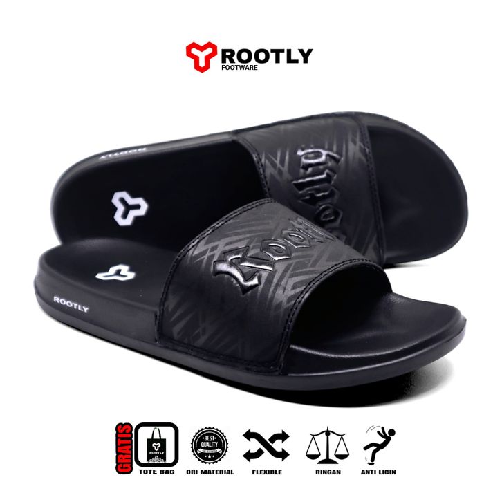 Rootly - Sandal Slipper Pria Slide On Full Black Anti Slip