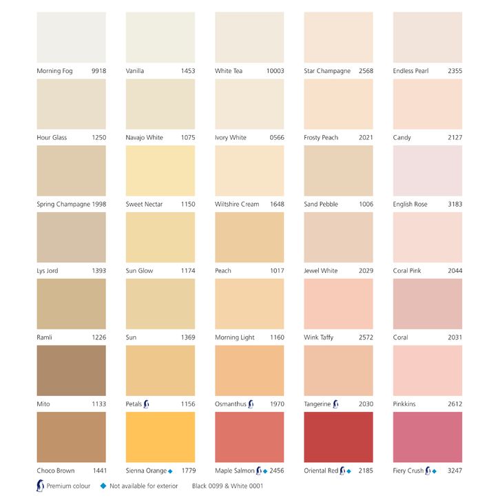 NEW WHITE, BRILLIANT WHITE 1001 , UPWARD , 0981 CREAM, CHI , LIGHT ANTIQUE 0471 , AROMA GARDEN 6263, PASHMINA 3186 , AQUA APPEAL, MINDFUL OF MAUVE , DAZE BAYOU 5279, MINTY BREEZE 7163 , JAZZ GREY 9930, SOUR ONION 7037 , PALE TEAL 5043, AMETHYST CREAM 2071- , SNOW-WHITE 5001, WHITE SATIN 0201 , MIST 1376 , BRAVE PURPLE, TWIG BROWN , POINT PLEASANT 067-5, ENGLISH ROSE 3183 , RIVER WATERS NP2021, HINT OF GREEN 7001 , HERBAL FUSION 8237, PISTACHIO NUT 2557T , BEACH HONEY 1122, LYS JORD 1393 , BRICKS 2193 , 71YY90/027 ICI, COASTAL WAVE 5041 , ARCTIC BLUE 4445, BARE 1391 , EMPIRE 0520 , BALANCE 6325, ROBENA 3113 , S0515-R40B , LINEN WHITE 1278, WHITE LINEN 10182 , MEGA PIPE 4457, MINT LEAF 7382 , S2020-B90G , SATIN BEIGE 8011, URBAN LIGHT 4507 , SWEET NECTAR 1150, LEMON ZEST 7408 , SWISS IRIS 4198, ICE TURQUOISE 5136 , MAPLE SALMON 2456, ETERNAL BLUE 4108 , SPACE 10678, MILKY WAY 1832 , MOSLEY 7418, PLATINUM BLUE 4151 , 10413 , WHITE MALVA 3144, ROSETTA STONE 2573 , CHOCO BROWN 1441, LENA 8063 , GLEAM 12079 , HILLSIDE 7385, DEEP SECRET 8205 , CANTAY 3241, EARTH BROWN 1417 , MOSS GREEN 7354, CLOVER LANE 8323 , SUN GLOW 1174 , CANDY 2127, ANTIQUE YELLOW 1392 , ROMANCE PINK 2015 , 8132, PLUMTIC 3214 , TREND 4136 , PURE WHITE 9010, APPLE WHITE 8190 , BLUE ASH 4399, COOL BENJI 7378 , LUNAR PLUM 4150, BLUE LAGOON 4164 , GLACIER 6011, VIOLET PEACE 4326 , CAPPUCCINO 1303, LOTUS ROOT 1108 , SANDY CORAL 1135, 4277 PALE FOLLIE , PAIGE 4520, BROWN SCRIPT 2630 , BLUE WHALE 5517, BLUSHING PEACH , CORAL PINK 2044, THUNDER GREY 8316 , SUAVE 9910, DRIFT OF MIST SW , PURPLE CANDY 4498, 0565 OFF WHITE , S0510-B90G, CRYSTAL SHADE 6265 , ADELE 7249, KHAKI 7039, 2588 ARTIST CLAY, OLIVE 8284, WILD RICE 1012, 5169 SUMMER BREEZE, SOFT LILAC 4448, TWILIGHT, SKYLIGHT, EARLY RAIN 0486, TIMELESS 1024, COTTON LACE 2594, CURIOUS MIND, PINKKINS, SOYA MILK 1105, SAGE GREEN 6013, PALM LEAF 0125, BAYSIDE BLUE, SENSE 1875, ALMOST SPRING, MATRIX, EVENING SKY, DUSK GREEN 7038, WHITE POETRY 8394, IMAGINE 6383, EGG WHITE 1001, MODERN BEIGE 12076, WASHED LINEN 10679, KNIGHT 3009, ALPHINE SNOW, OXFORD RIVER, PLATINUM, TREASURE 7628, CYPRESS 7040, EDELWEISS 1622, CRISP 8118, OLD FRESCO 2458, ALLADIN 4468, PURE BARLEY, WHITE CLAY 5272, SPACE GREY 5255, SANDBEIGE 1939, SPRING CHAMPAGNE, MICHA MINT 7381, SEA EMERALD 6084, DREAM 3154, EARTHSCAPE 1053, SILVER CLAY 5045, FIERY CRUSH 3247, TEA FLOWER 2104, TRANSPARENT PINK, SHALLOW WAVE 4094, 1516, ELEGANT 1434