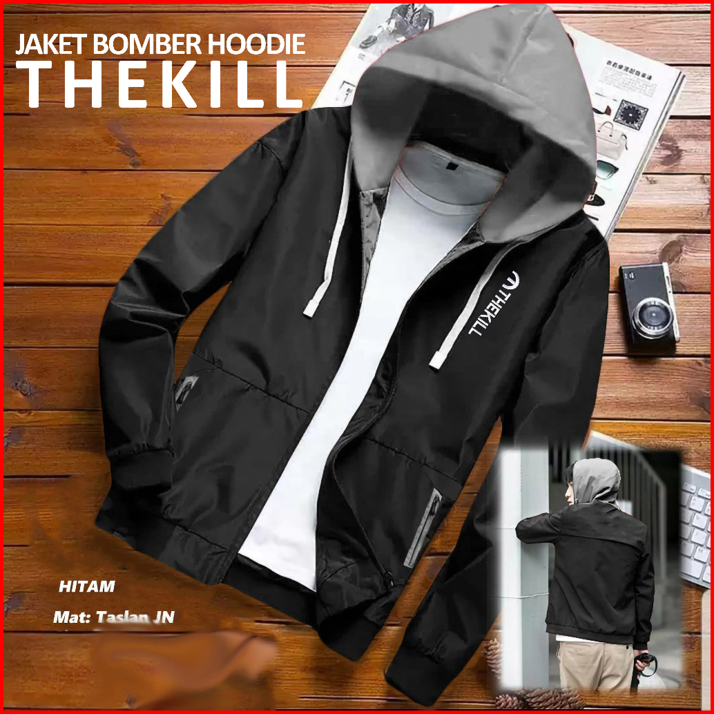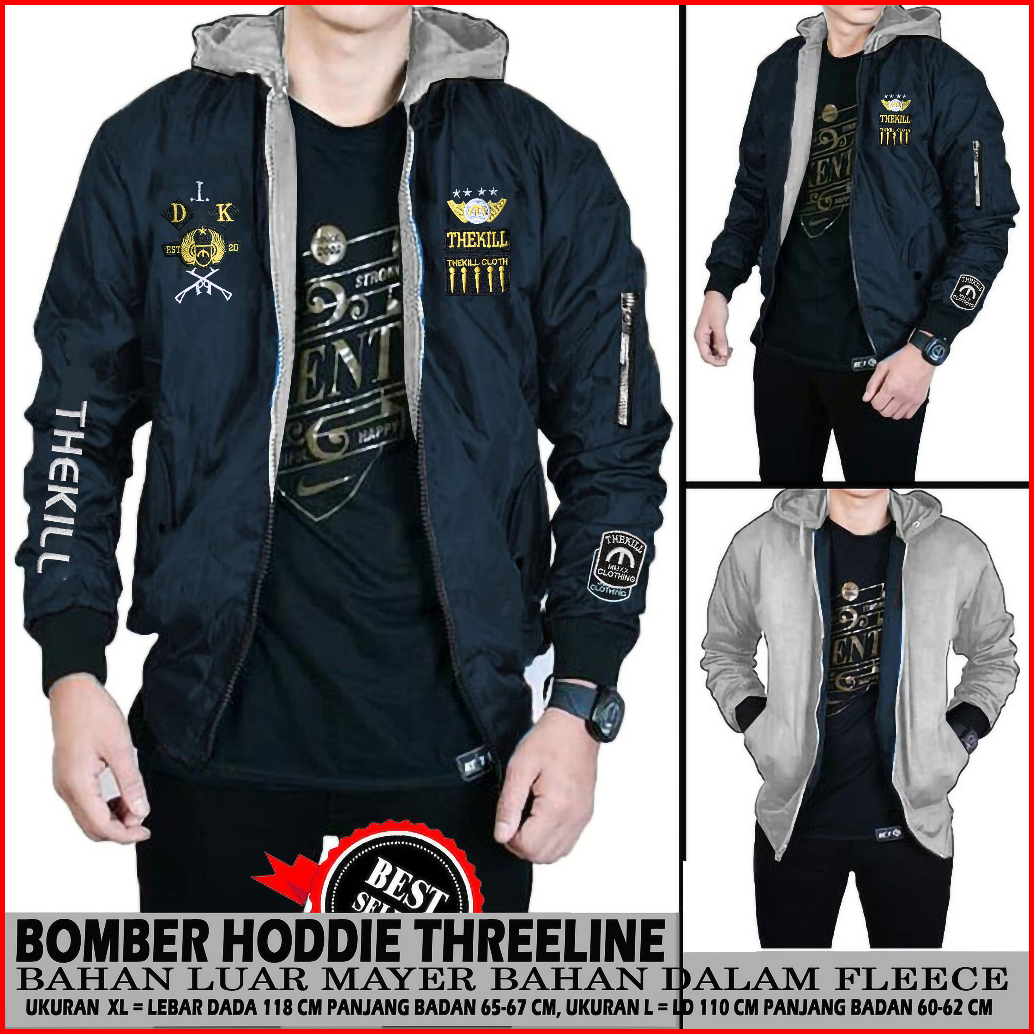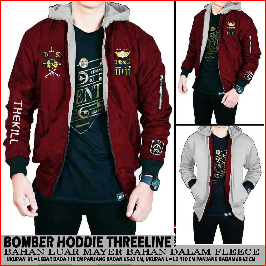 Jaket Bomber Hoodie Pria Wanita Unisex Threeline Bahan Parasut