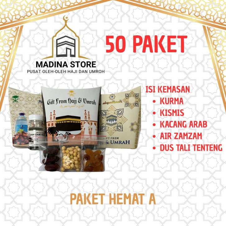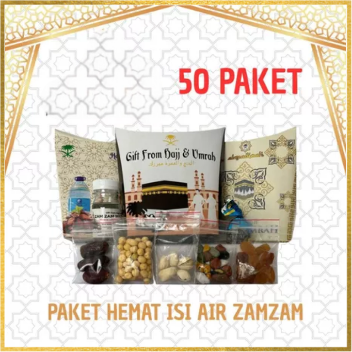 PAKET MURAH isi 50 pcs Oleh Oleh Haji / Paket Oleh Oleh Umroh/ Souvenir Kardus Isi Air Zam Zam Kurma Kismis Kacang Arab