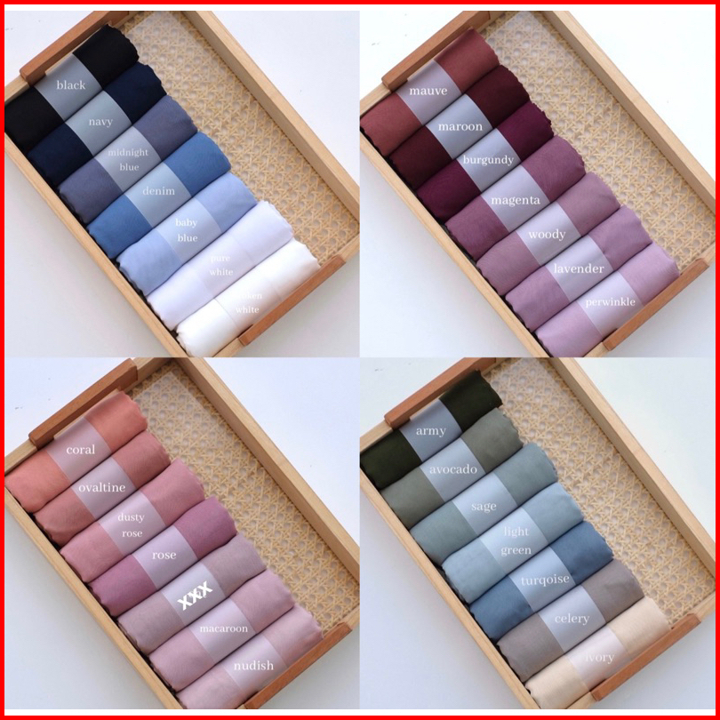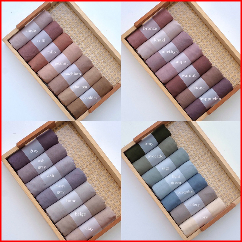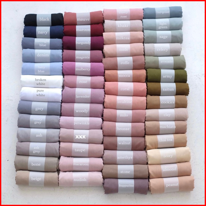 Black, Navy, Midnight Blue, Denim, Baby Blue, Broken White, Pure White, Dark Grey, Misty Grey, Ash, Ash Grey, Bone, Beige, Mauve, Coral, Burgundy, Rose, Lavender, Woody, Perwinkle, Taupe, Macaron, Nudish, Dusty Rose, Khaki, Nude, Coffe, Milo, Ovaltine, Bronze, Walnut, Ametyhs, Stone, Frappucino, Magenta, Light Green, Sage, Celery, Avocado, Army, Clay, Machiato, Thai Tea, Ivory, Peanut, Turqoise, Maroon, Cookies
