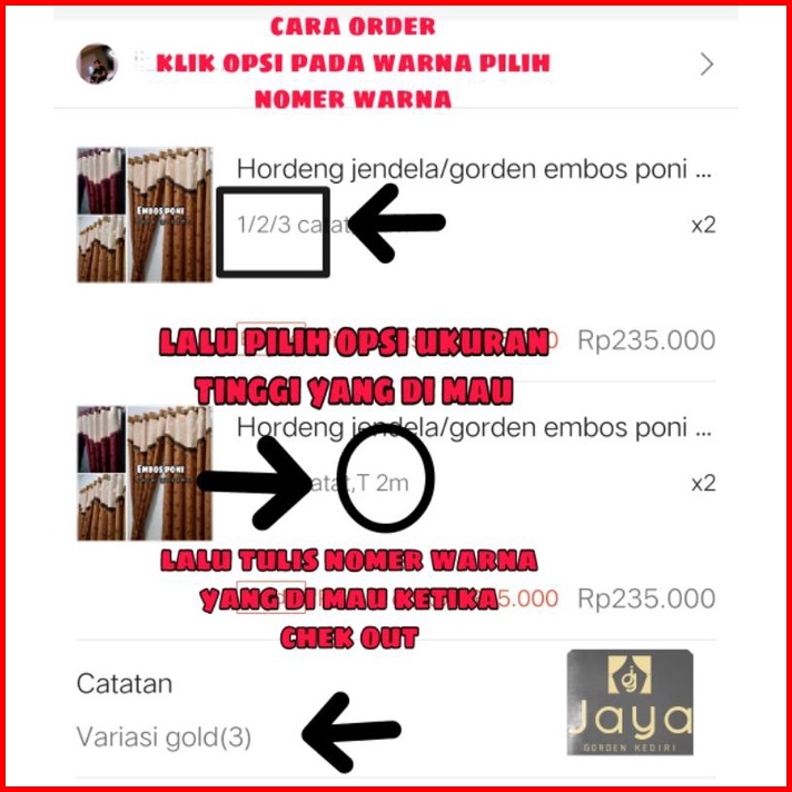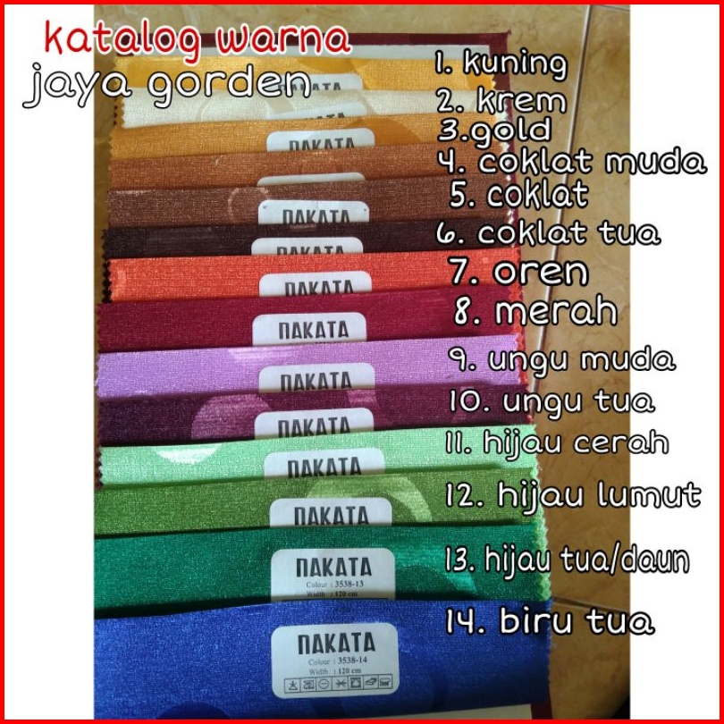 Gold, 4. Coklat, 5. Hijau, 6.merah/maron, 7. Biru, 8. Lilac/ ungu muda, 9. Hijau toska, 10. Abu-abu, 11. Pink, Mocca