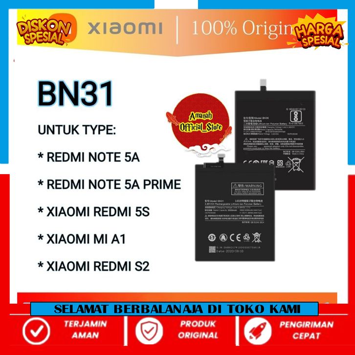 ASLI BATERAI XIAOMI REDMI BN31 REDMI 5X, MI A1, REDMI NOTE 5A, 5A PRIME, 5S BN31 ORIGINAL 100% BERGARANSI BERKUALITAS