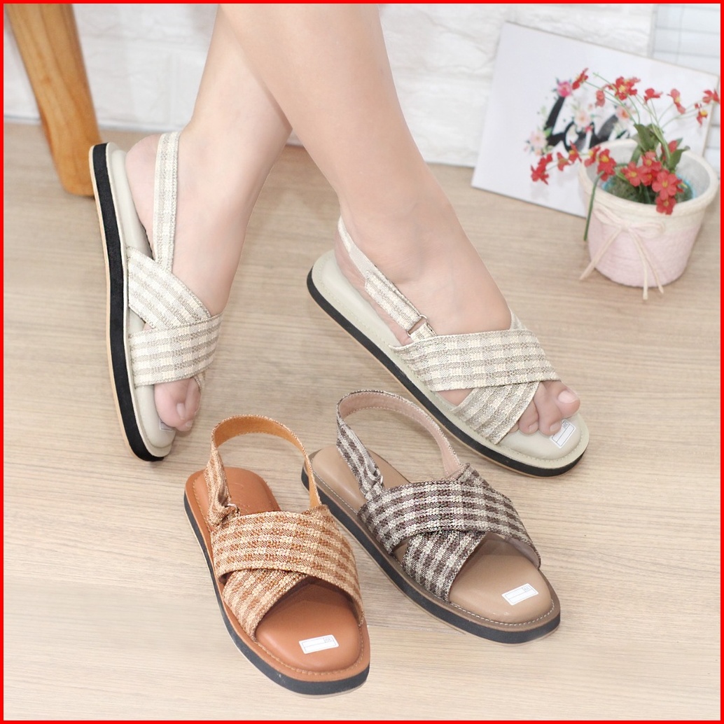Sandal Wanita Korea Motif Kotak Kotak Terbaru Tali Belakang Flat Puffy - Maudy