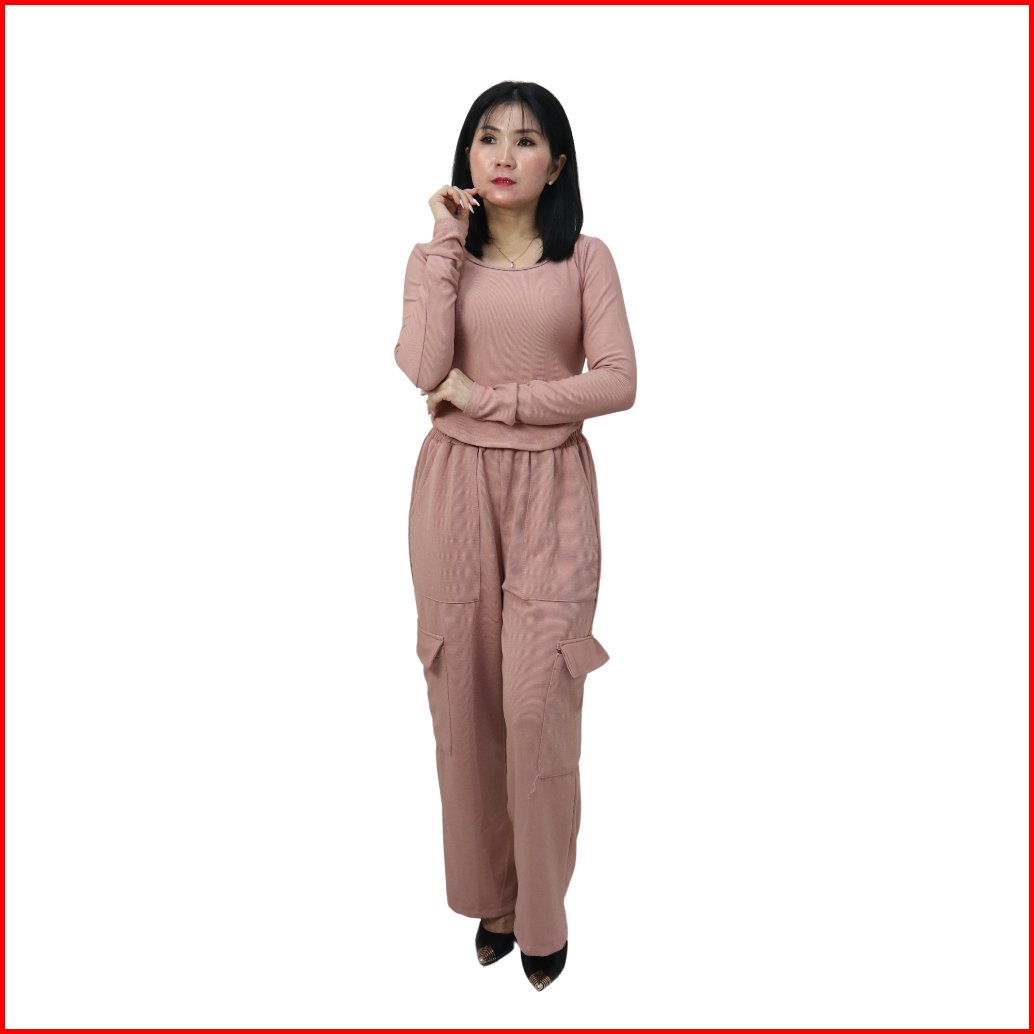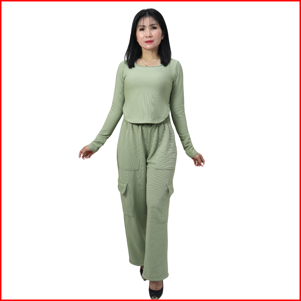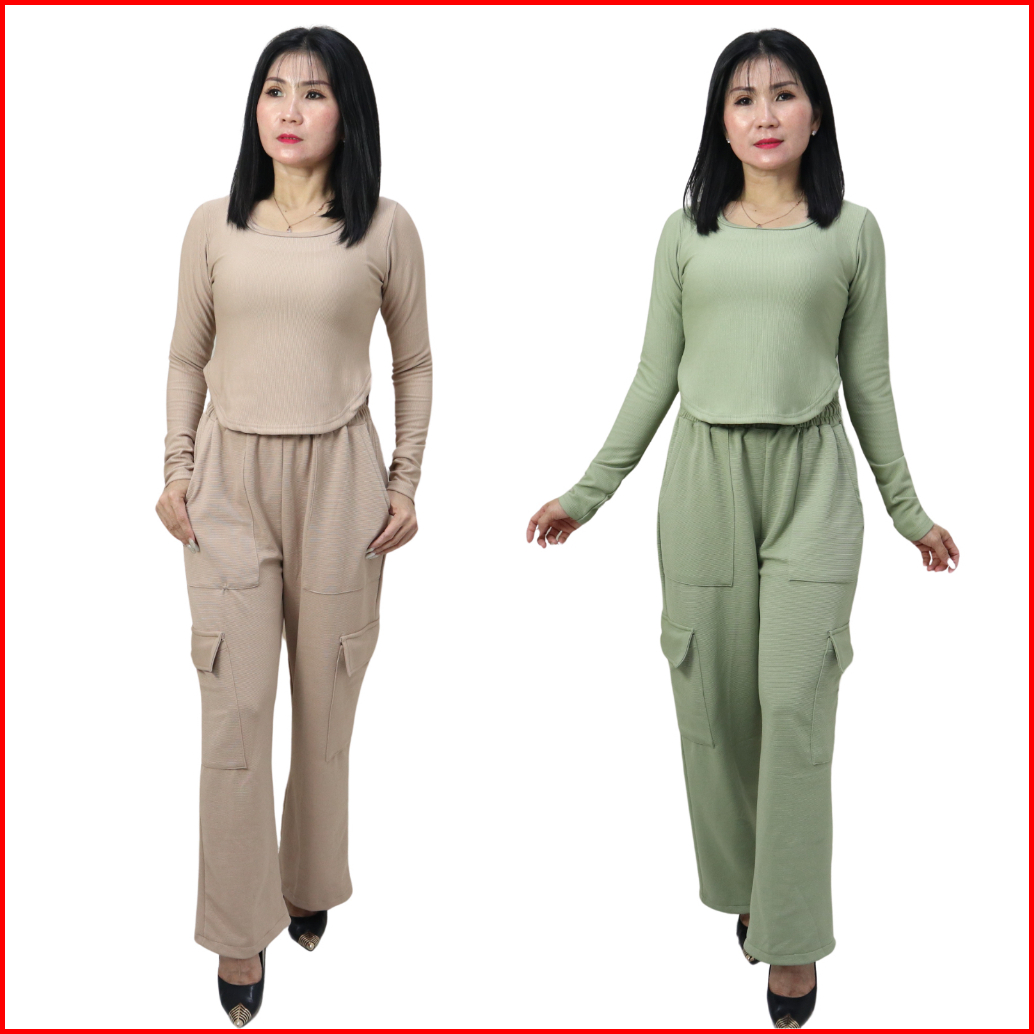 Set Crop Top Premium Rib Knit Pants - Baju Atasan Dan Celana Cargo Panjang Wanita Korean Loose Pants Kargo
