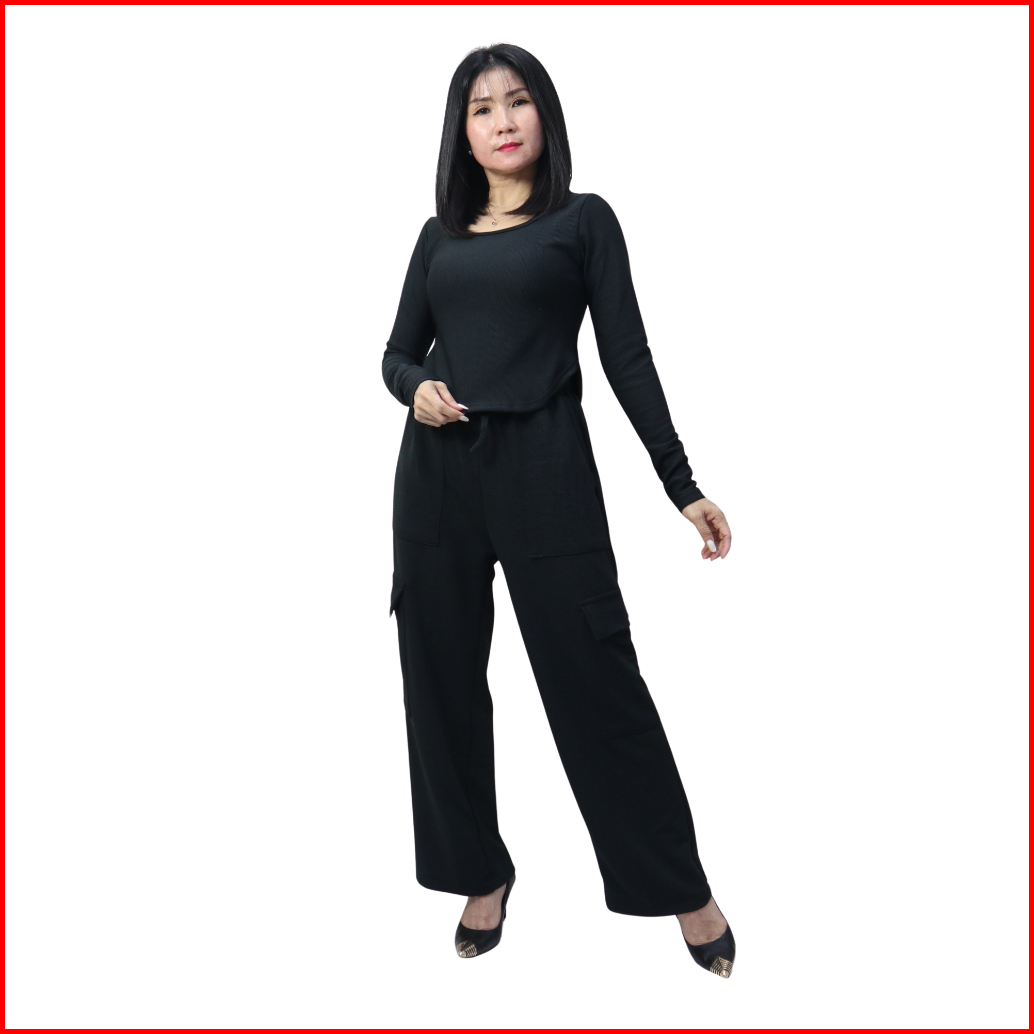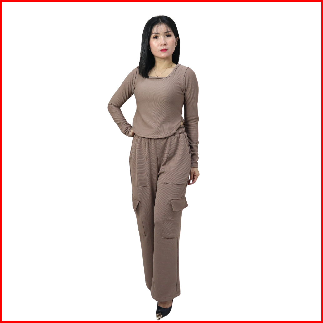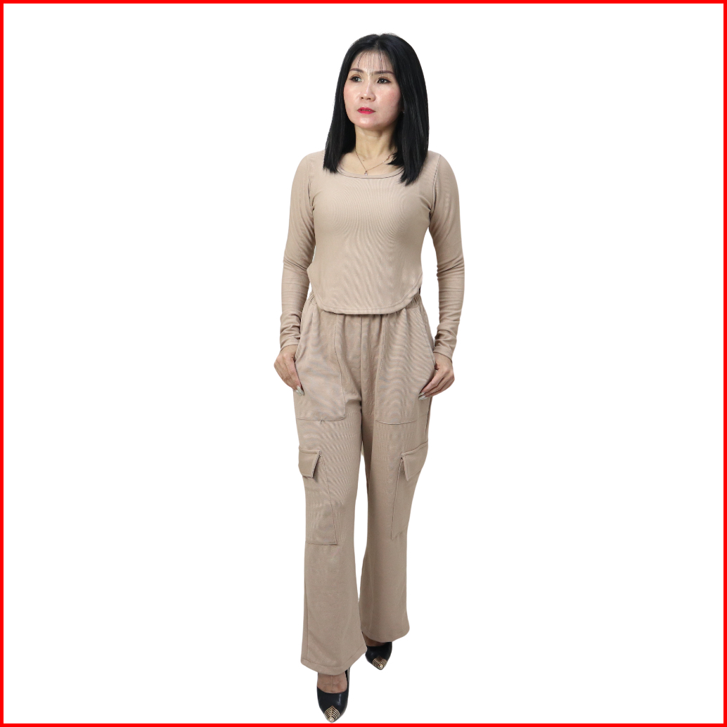 Set Crop Top Premium Rib Knit Pants - Baju Atasan Dan Celana Cargo Panjang Wanita Korean Loose Pants Kargo