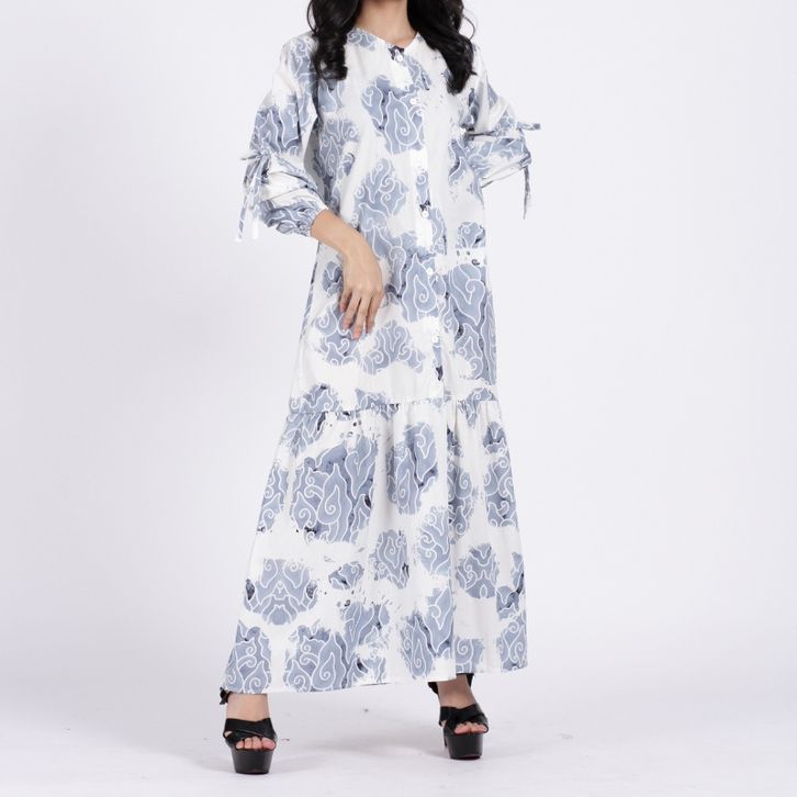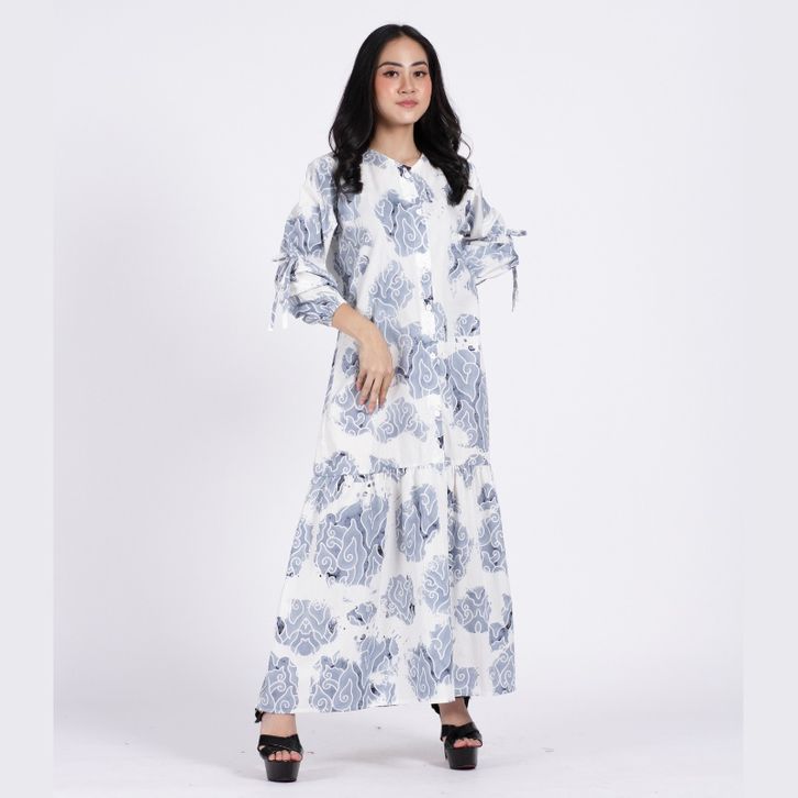 BATIK TRUSMI SET COUPLE DRESS DAN KEMEJA BATIK MOTIF MEGA MENDUNG BUMI PITA BIRU