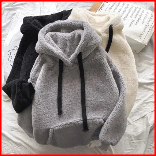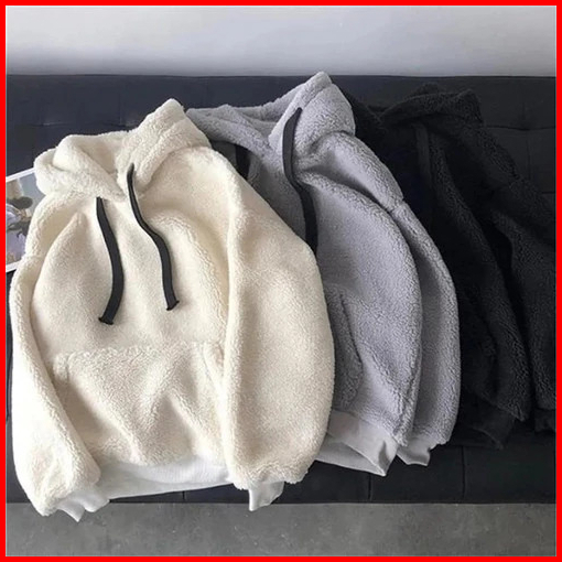 Jaket Hoodie Bulu Pria Polos Jaket Sherpa Pria Hoodie Bulu Domba Imitasi Unisex Cowok Cewek Wanita