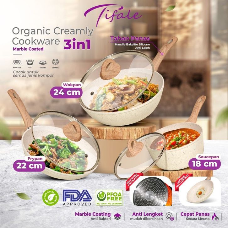 TIFALE 3IN1 ORGANIC CREAMLY COOKWARE MARBLE COATED ANTI LENGKET HANDLE BAKELITE SILICONE ANTI LELEH AVOCADO PAN