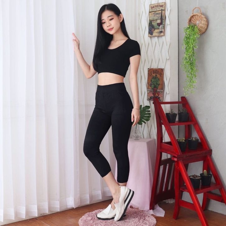 Celana Legging Sport Highwaist Cewek Yoga Senam Motif Polos Korean Style Anti Robek Slimfit Standar Jumbo