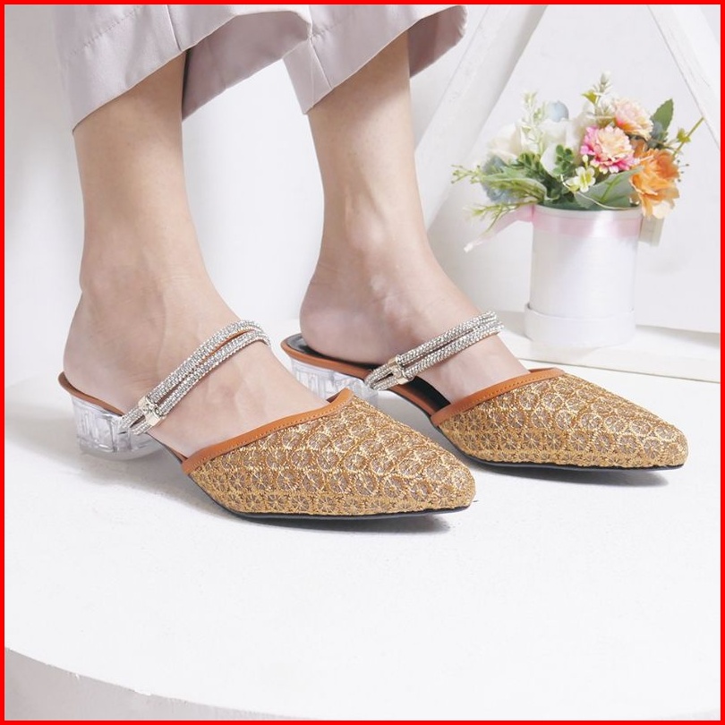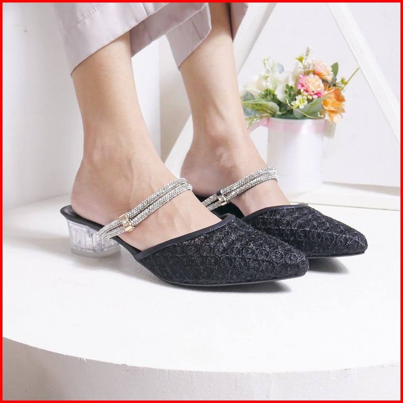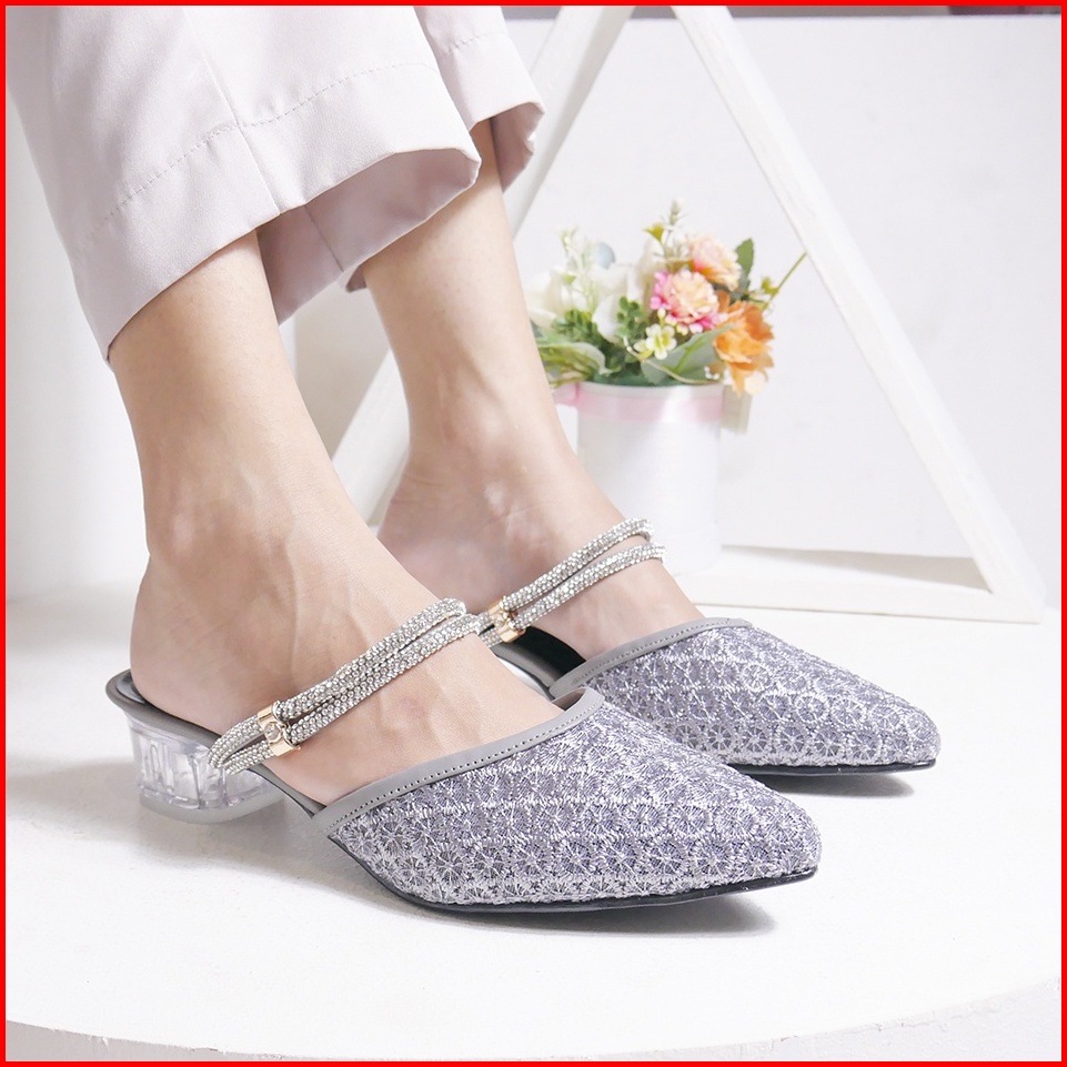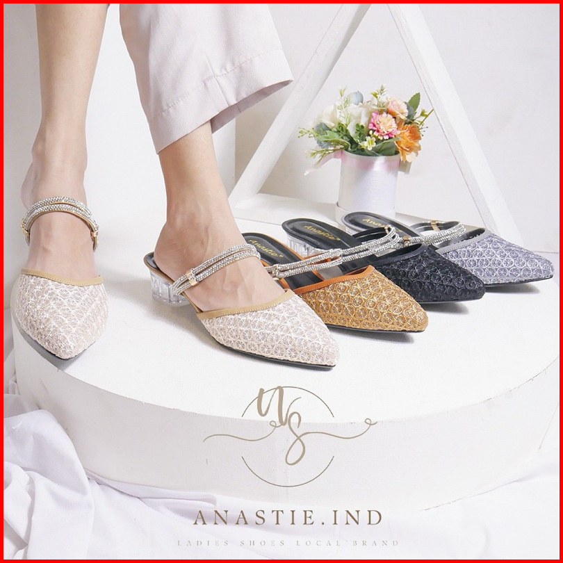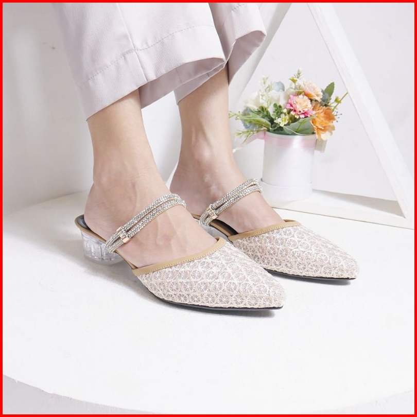 Anastie Rachel - Sendal Wanita Sendal Heels Brukat Pesta Formal Kombinasi Mutiara Hak Kaca 3cm