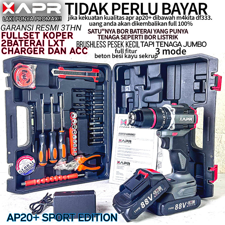 APR Japan AP20+ Bor Baterai Cordless 13mm 88v Gen 4 Brushless Untuk Besi Kayu Beton Fullset Koper Garansi Resmi