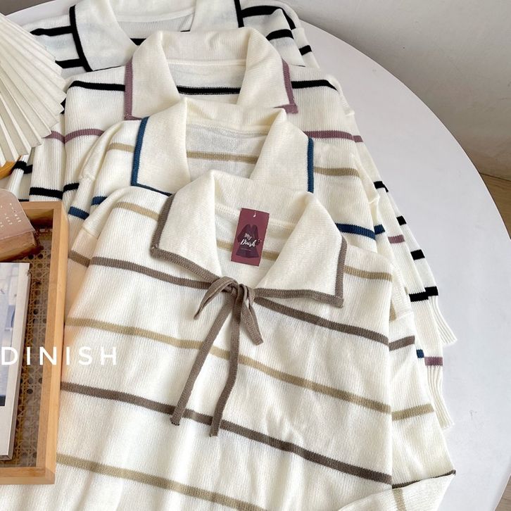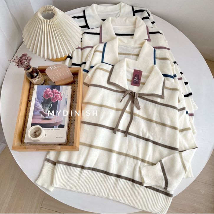 Atasan Blouse Rajut Wanita Motif Garis Korean Style Hesty Polo Terbaru Kekinian Best Seller